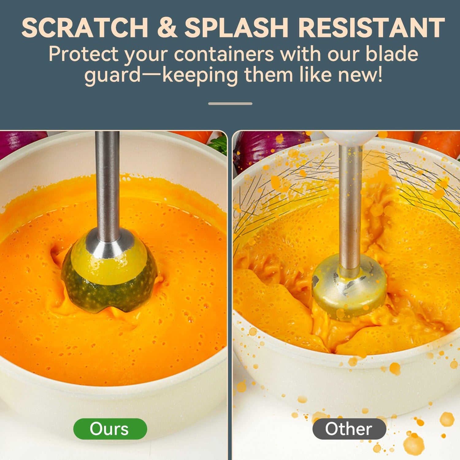 - HAND BLENDER SET: The 7-in-1 immersion blender set comes with 2 blades (Stainless Steel 4-Leaf Blade and ice crusher blade), and features unique bell guard that safeguards non-stick cookware from scratches and reduce suction, prevents food splatters, Emulsions blender also includes 500 ml chopper, 20oz measuring cup, whisk, milk frother, accessories holder, and 5 ft. power cord.