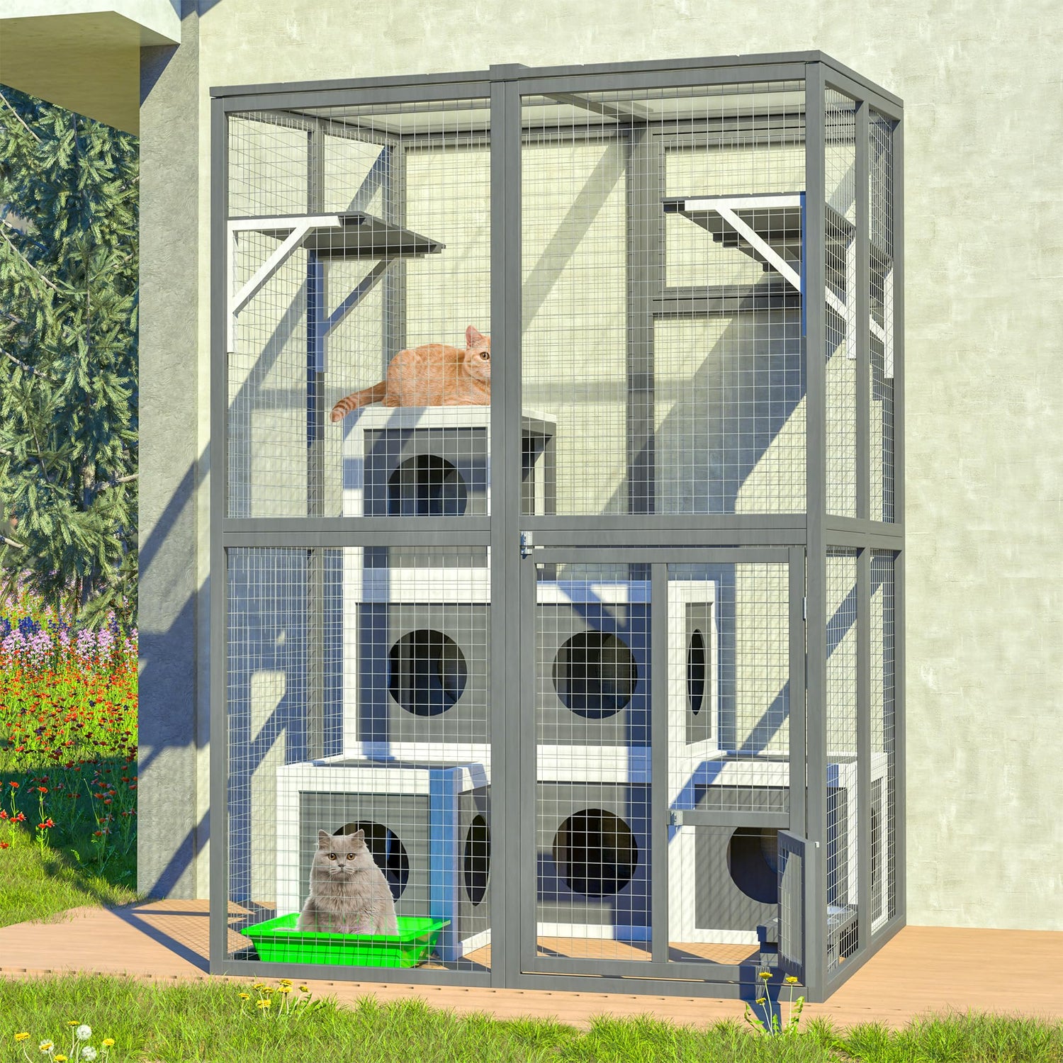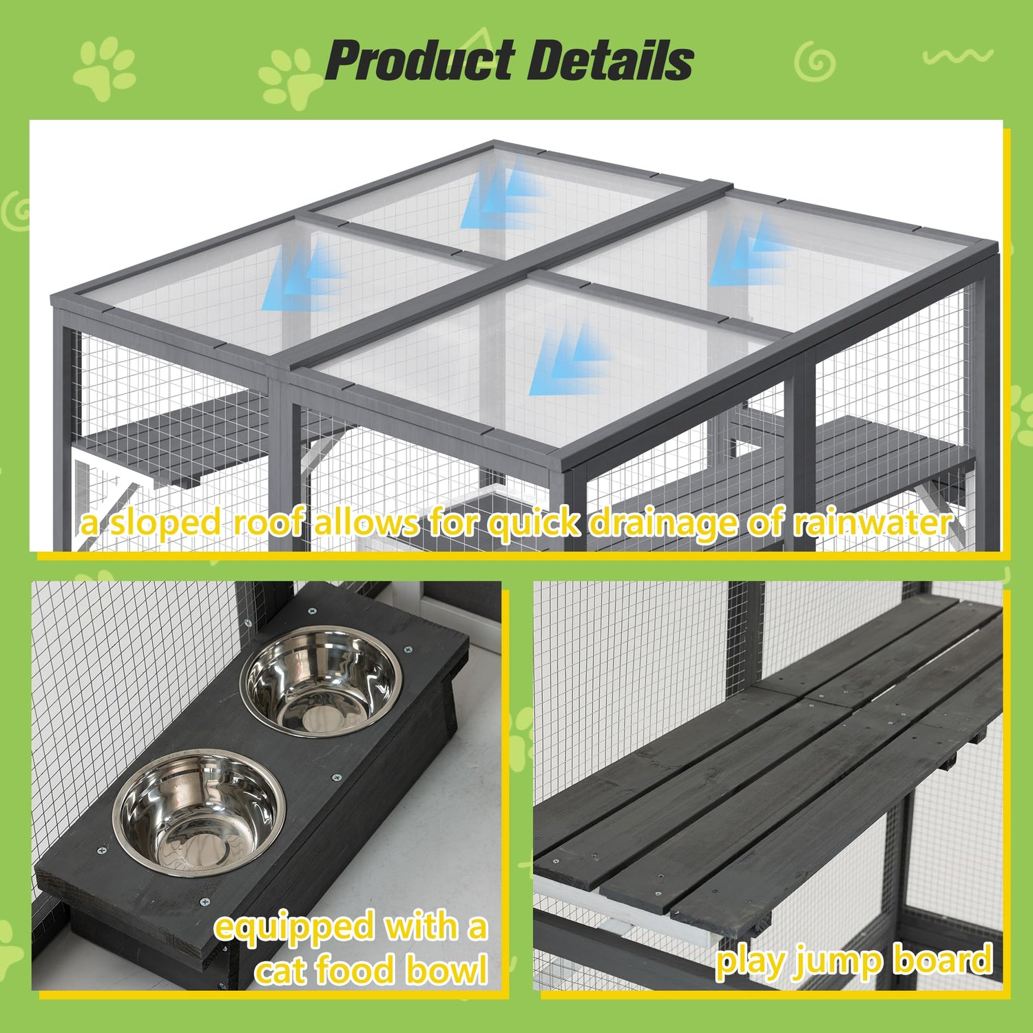 Linkhoo Large Wood Outdoor Catio Cat Enclosure with Weatherproof Roof and Food Bowl, Cat House Cage Playpen w/ 2 Jumping Platforms & 7 Napping Houses, Walk-in Kitty Kennel Indoor Condo Shelter, Grey