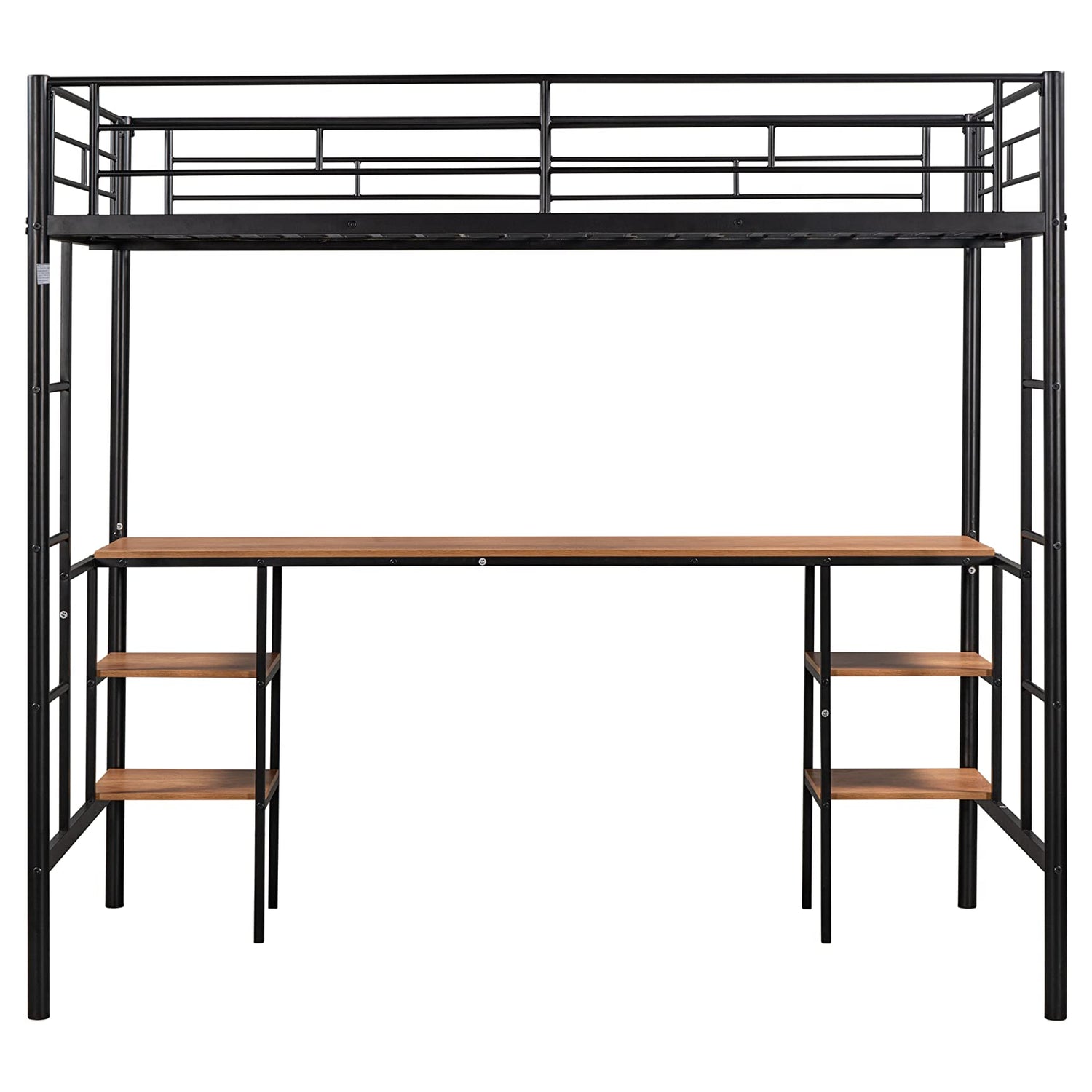 Details: Twin-size Loft Bed with Table & Shelves/ Heavy-duty Sturdy Metal/ Built-in Table & Shelves/ Noise Reduced/ Safety Guardrail/ 2 Side Ladders/ CPC Certified/ No Box Spring Needed, Stylish Loft Bed with Integrated Study Area, Storage Shelves, and Noise-Reducing Features Experience efficient space utilization as you create a dedicated study haven, surrounded by convenient storage shelves for books and essentials. But that's not all – we've taken care of every detail. Our loft bed boasts EVA on supporting beams, ensuring noise reduction for undisrupted focus. The added slat lockers further enhance the quietness of your environment. Embrace versatility, organization, and peace of mind, all in one stylish package. Make the most of your space with our exceptional loft bed design today.