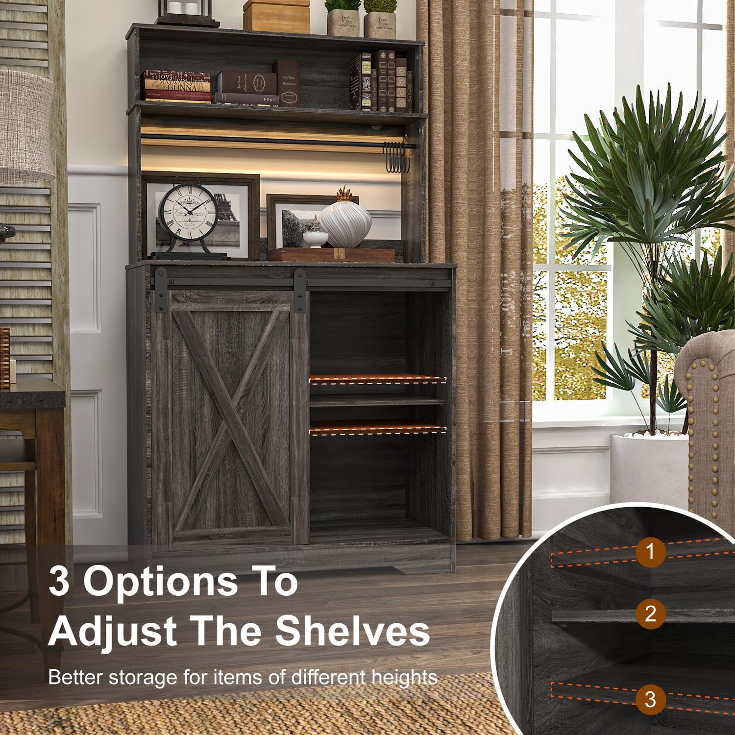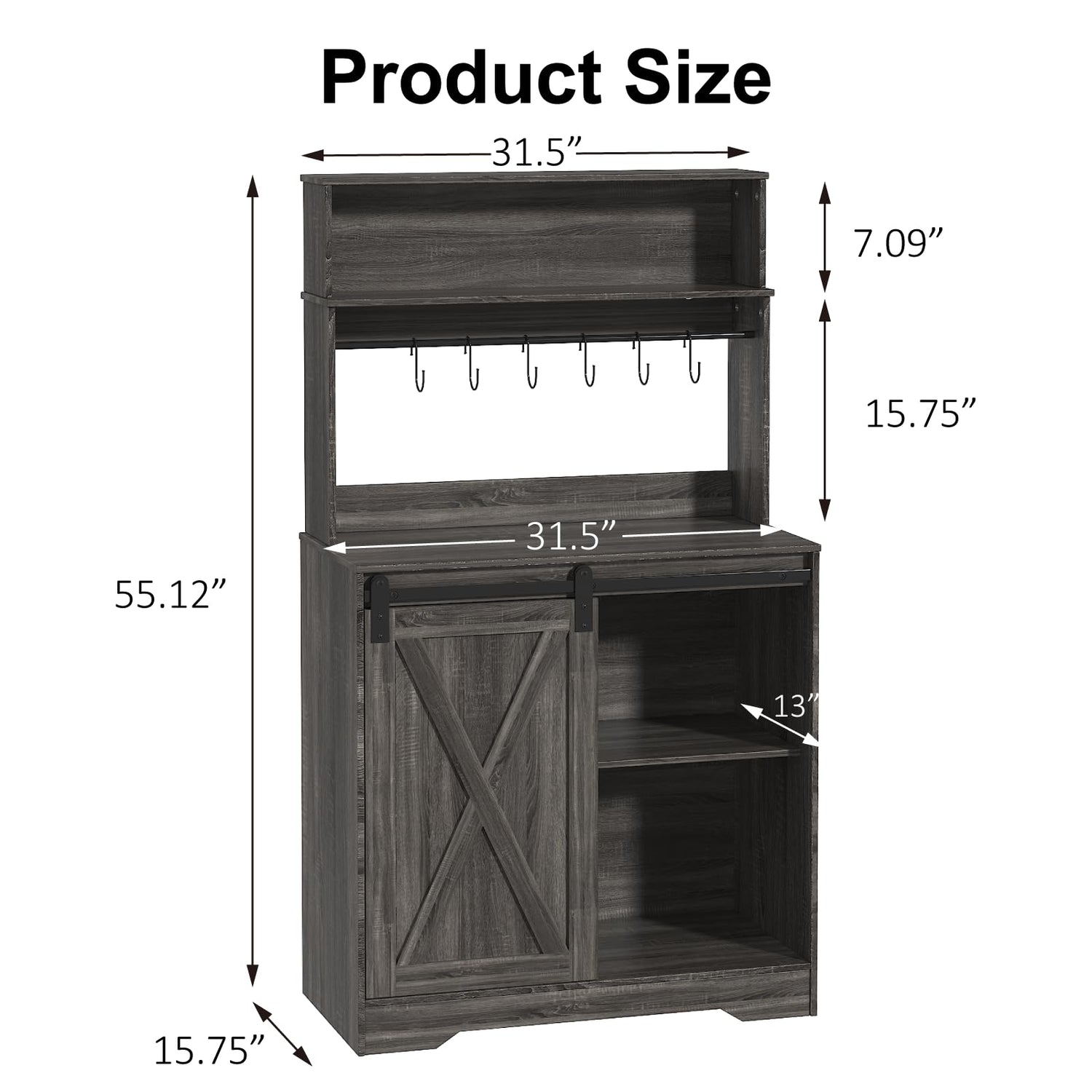 - 【EXTRA LARGE STORAGE SPACE】Compared with traditional coffee bar cabinets, our coffee bar cabinet has more storage space and is clearly partitioned.Our bakers rack is divided into three tiers for more storage space and clear compartmentalization. With 6 hooks on the coffee bar table, you can easily organize your cups.The interior of the farmhouse coffee bar has adjustable panels to hold items of various heights.