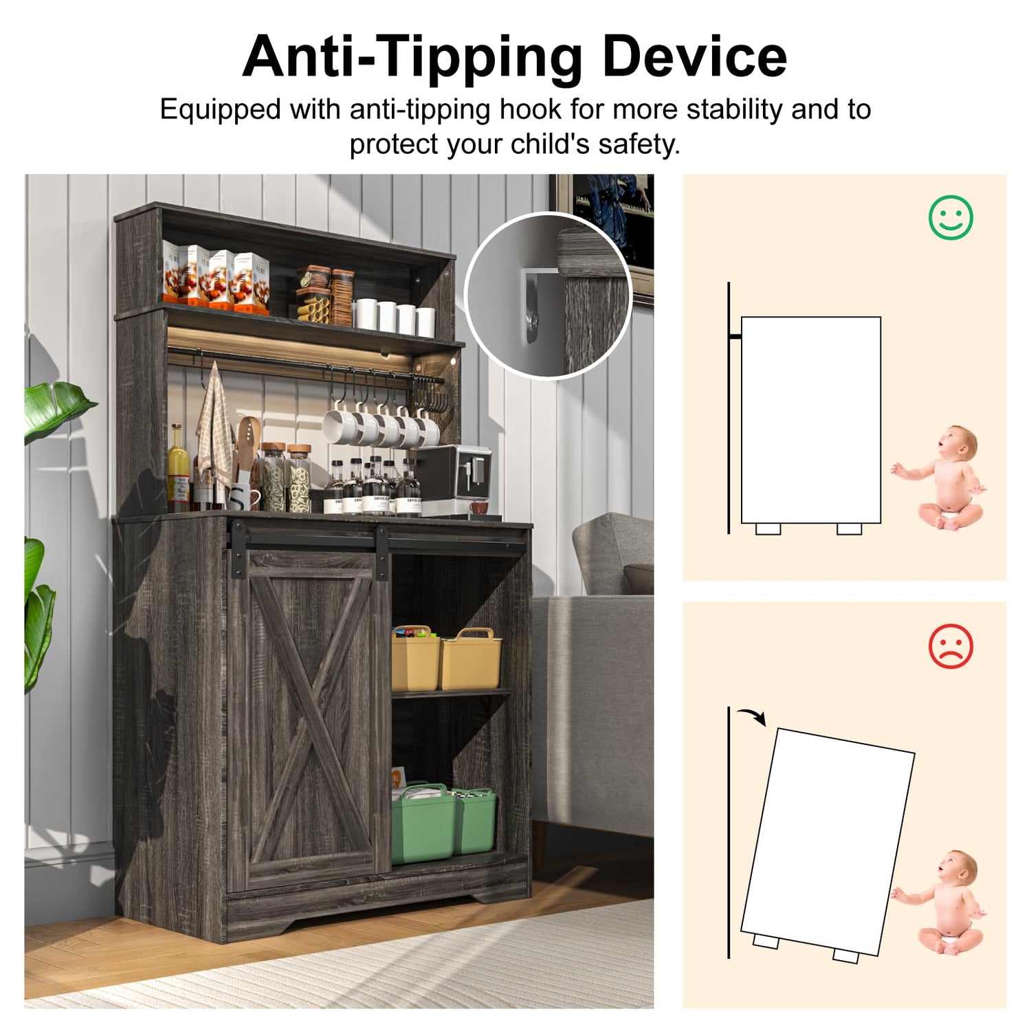 - 【QUALITY WOOD】Farmhouse Coffee Bar Cabinet with Storage is made of high quality wood and the high quality Comes with a sturdy base and anti-tipping device to ensure stability and durability. Easy to clean, perfect for storing kitchen appliances and preparing food