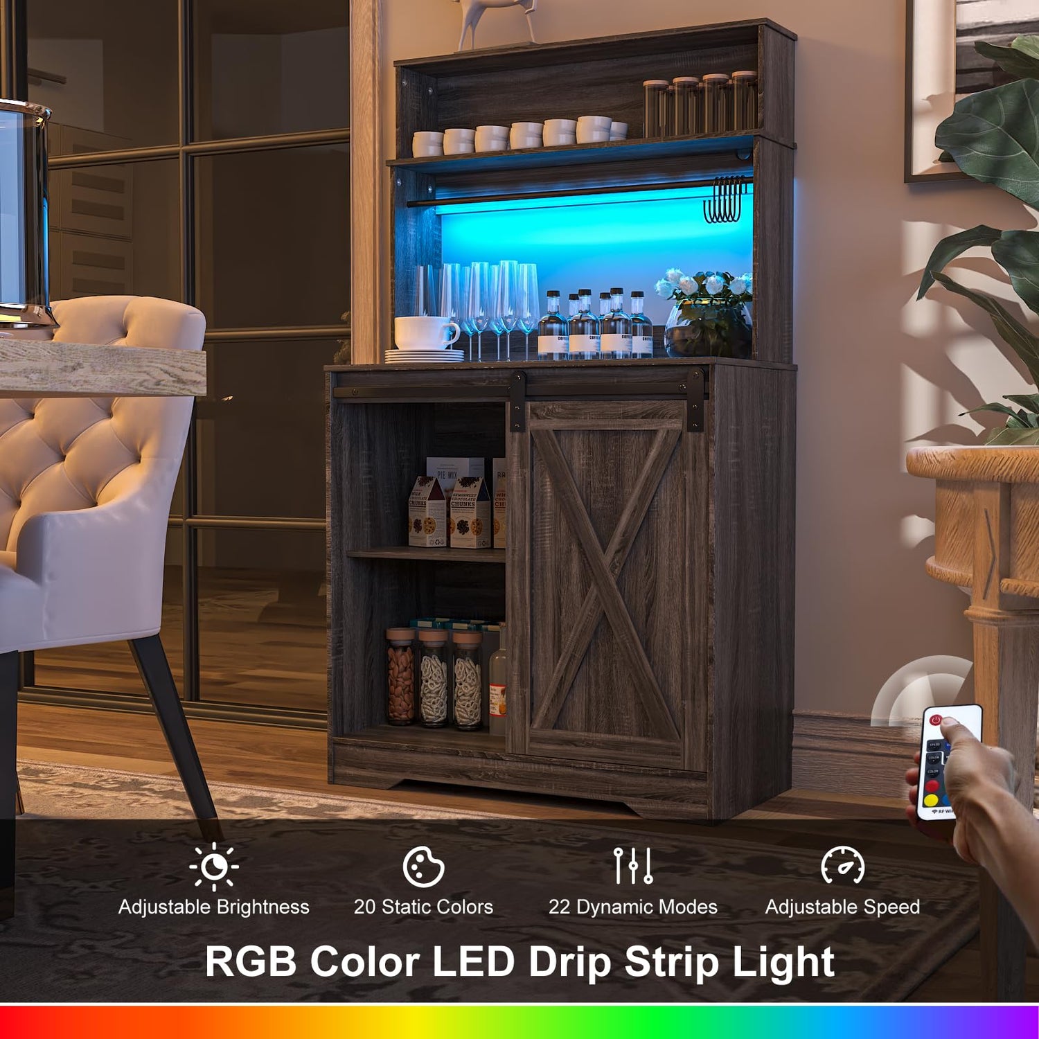 - 【WITH LED STRIP LIGHT】This coffee bar cabinet with storage is paired with a USB port LED drip light with RGB illusion effect. With a 16-button RF remote control to enhance the ambiance.