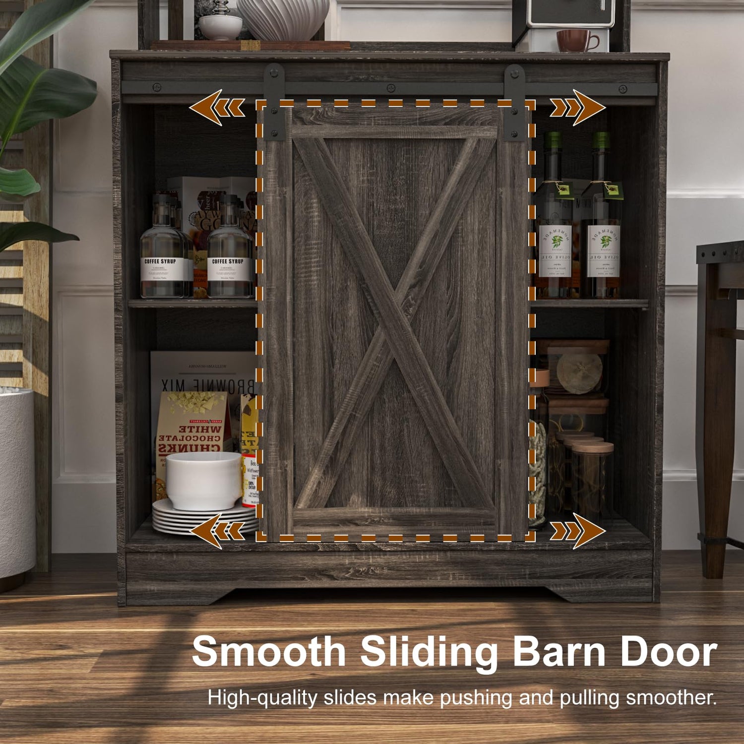 - 【FARMHOUSE STYLE】The coffee station cabinet features X-shaped design sliding barn doors that pull smoothly from side to side.The design is classic and keeps your dishes clutter-free.This kitchen storage cabinets can be placed in the kitchen, dining room, parlor, etc., both decorative and practical.