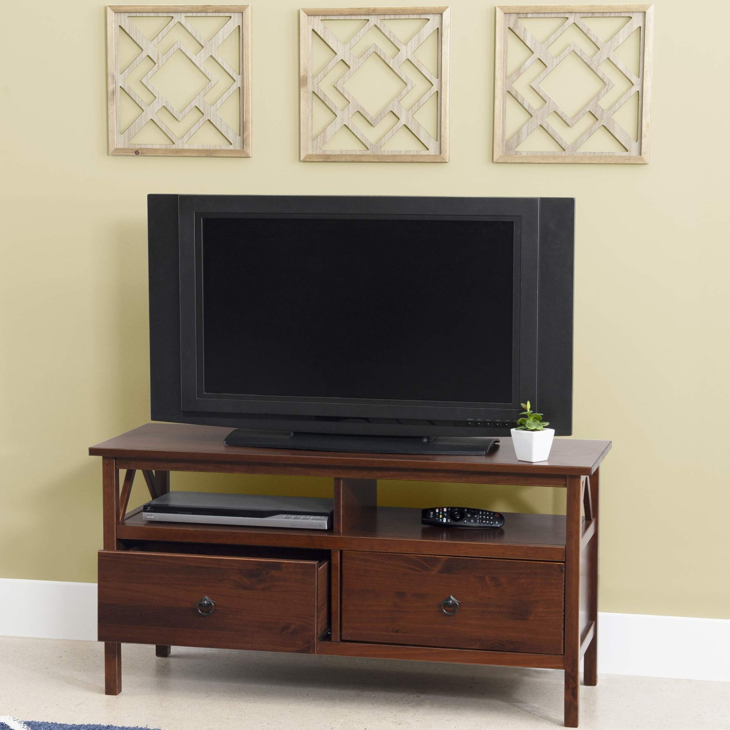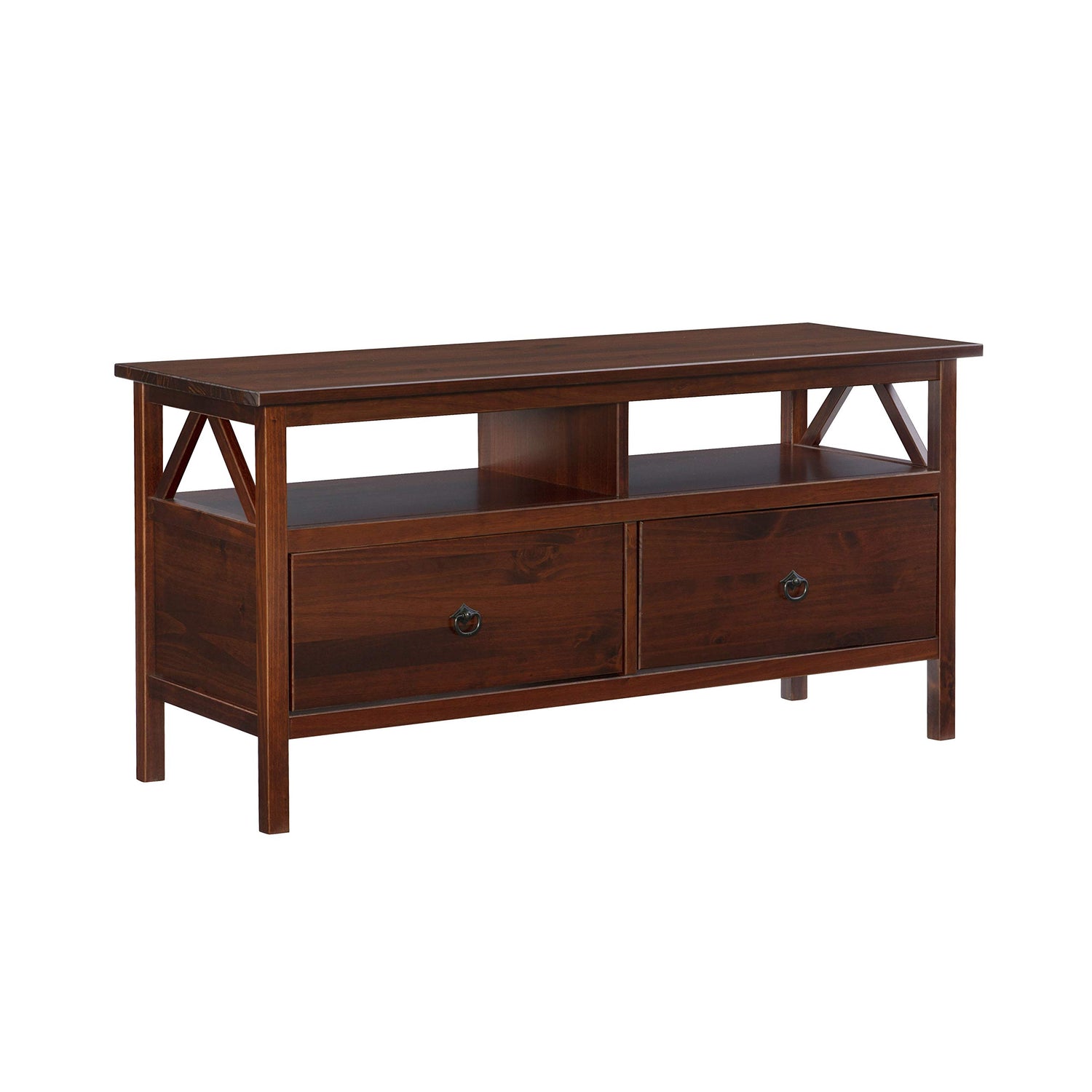 Details: Our Titian Collection has a simple yet eye-catching design that is matched with incredible durability. The TV Stand features a simple body that makes it perfect for any space. A spacious tabletop, open shelf and two deep drawers provide ample storage space for all of your media needs. A neutral, classic Antique Tobacco finish allows this piece to easily complement your homes decor.