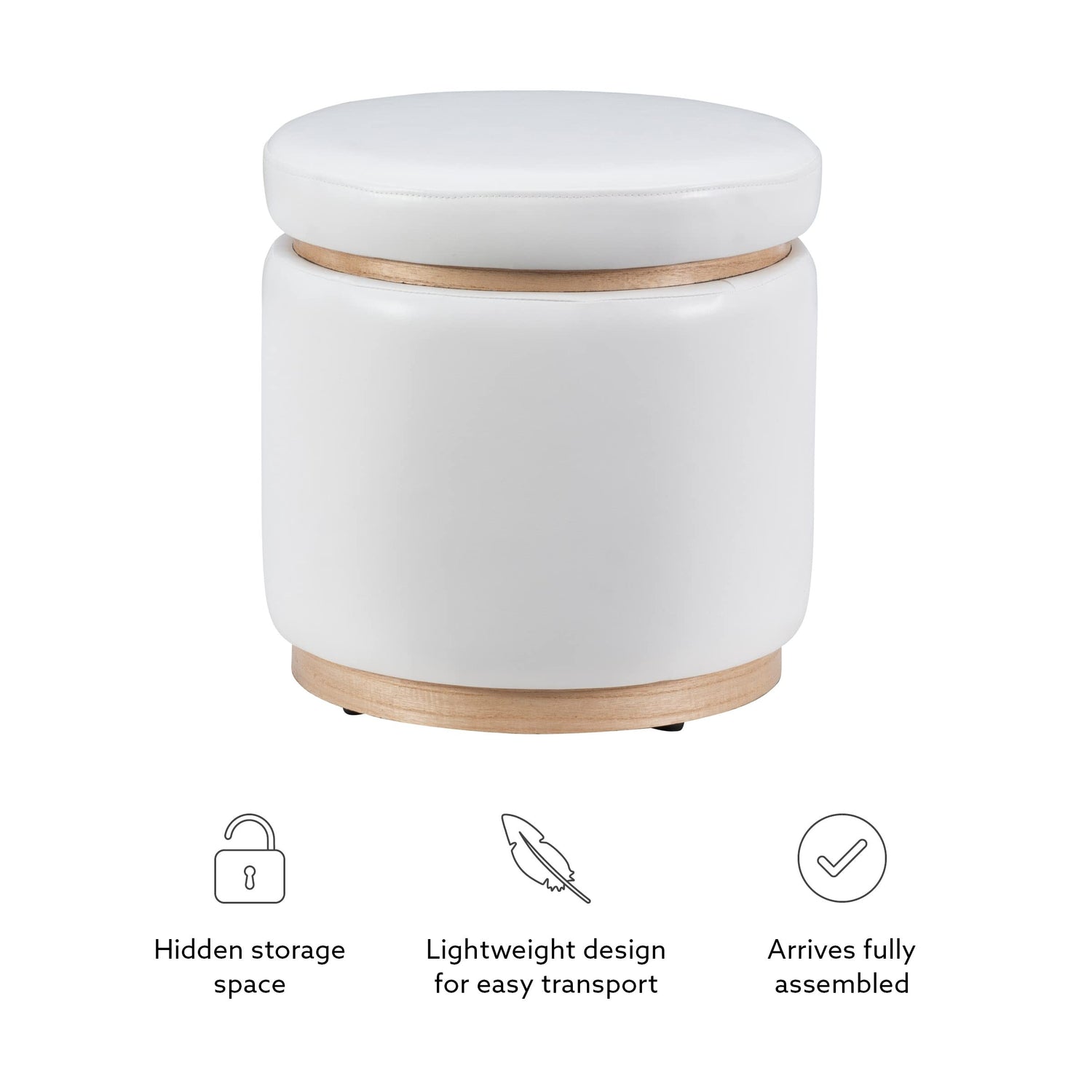 Linon Lexington White Faux Leather Round Storage Ottoman with Wood Accent