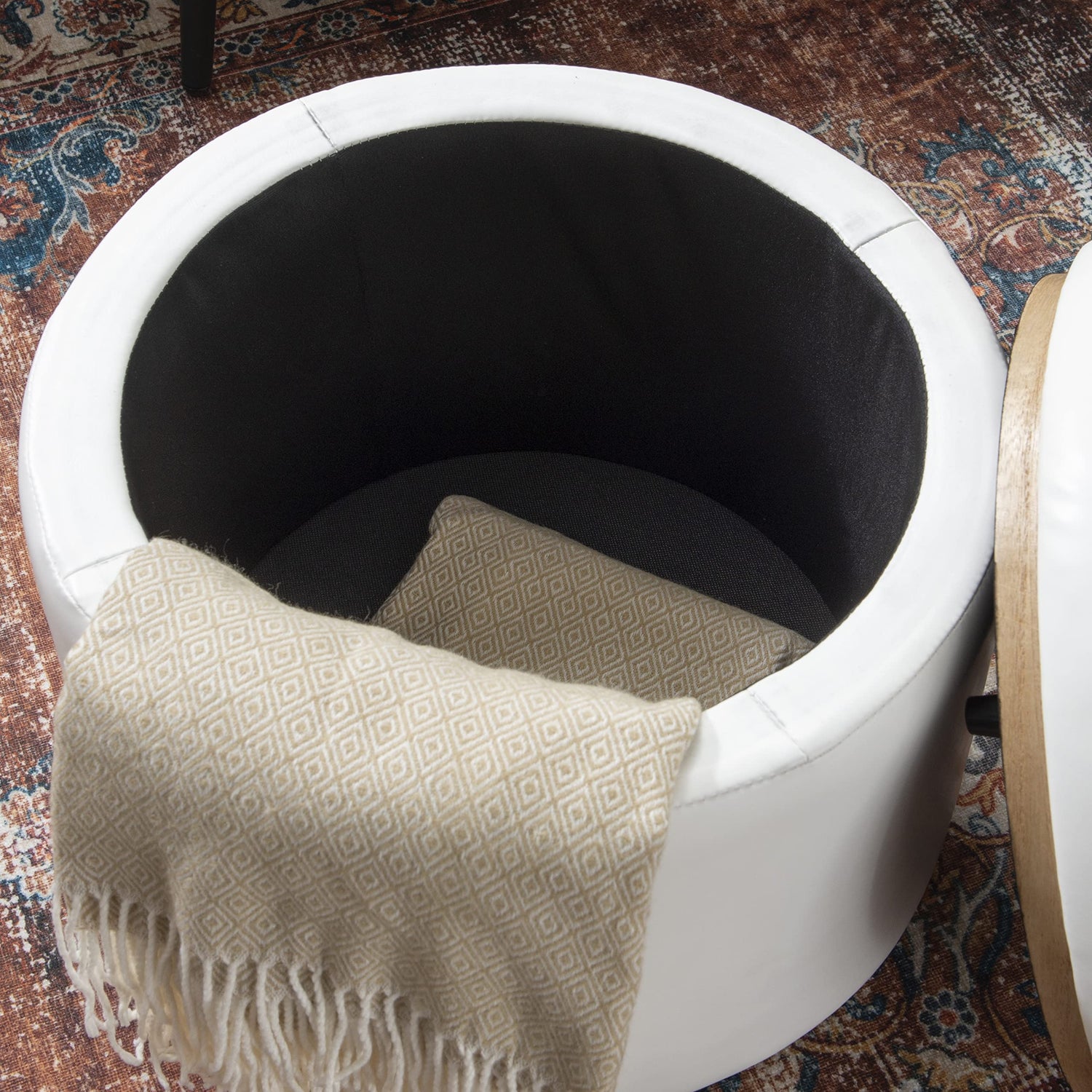Details: Versatility, comfort and style come together in this best selling storage ottoman. Perfect for tucking away stray blankets, magazines and electronics in a hurry, this piece also doubles as a comfortable footrest or extra seating. Sleek white faux leather covers the side panels and removable lid, while the 13.75” W x 13.75” D x 13.75” H interior space is fully lined with black felt. Pinewood trim in a natural finish provides a quiet accent, adding to the refined nature of the piece. Subtle storage is the name of the game when it comes to maximizing space in your home, and this ottoman is the star player.