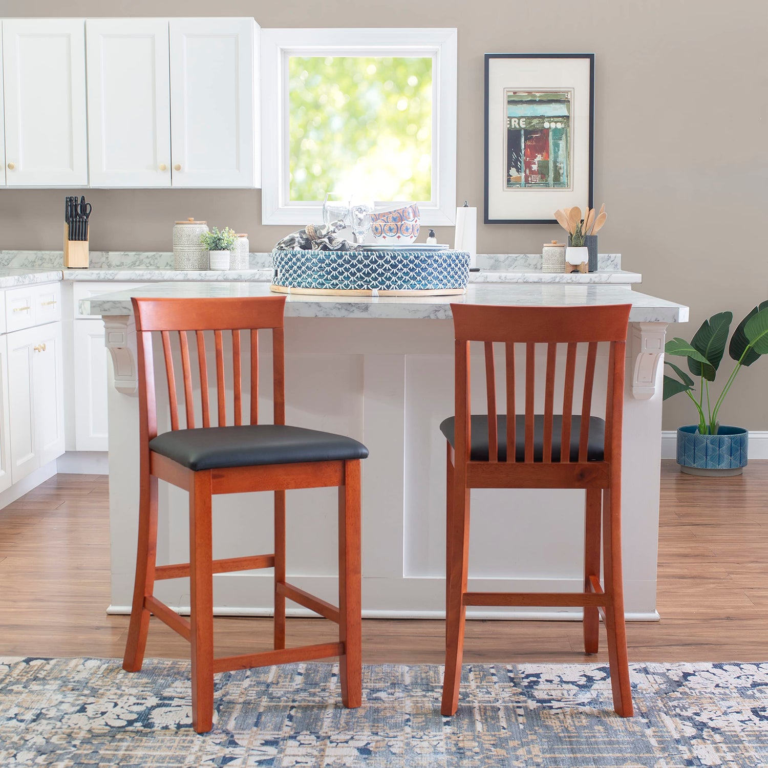 Details: With a traditional Mission back styling, this Triena Craftsman Counter Stool will enhance your dining area with its casual charm. The rich Red Cherry Wood finish, black vinyl padded seat, and 24-inch high seat give this bar stool a timeless allure. Solid construction and quality craftsmanship have made this counter stool both sturdy and attractive. This counter stool fits beautifully into a casual or formal décor. 275 lbs Weight Limit. Assembly Required. Seat height is 24" Dimensions: 17"w x 19.5"d x 37"h