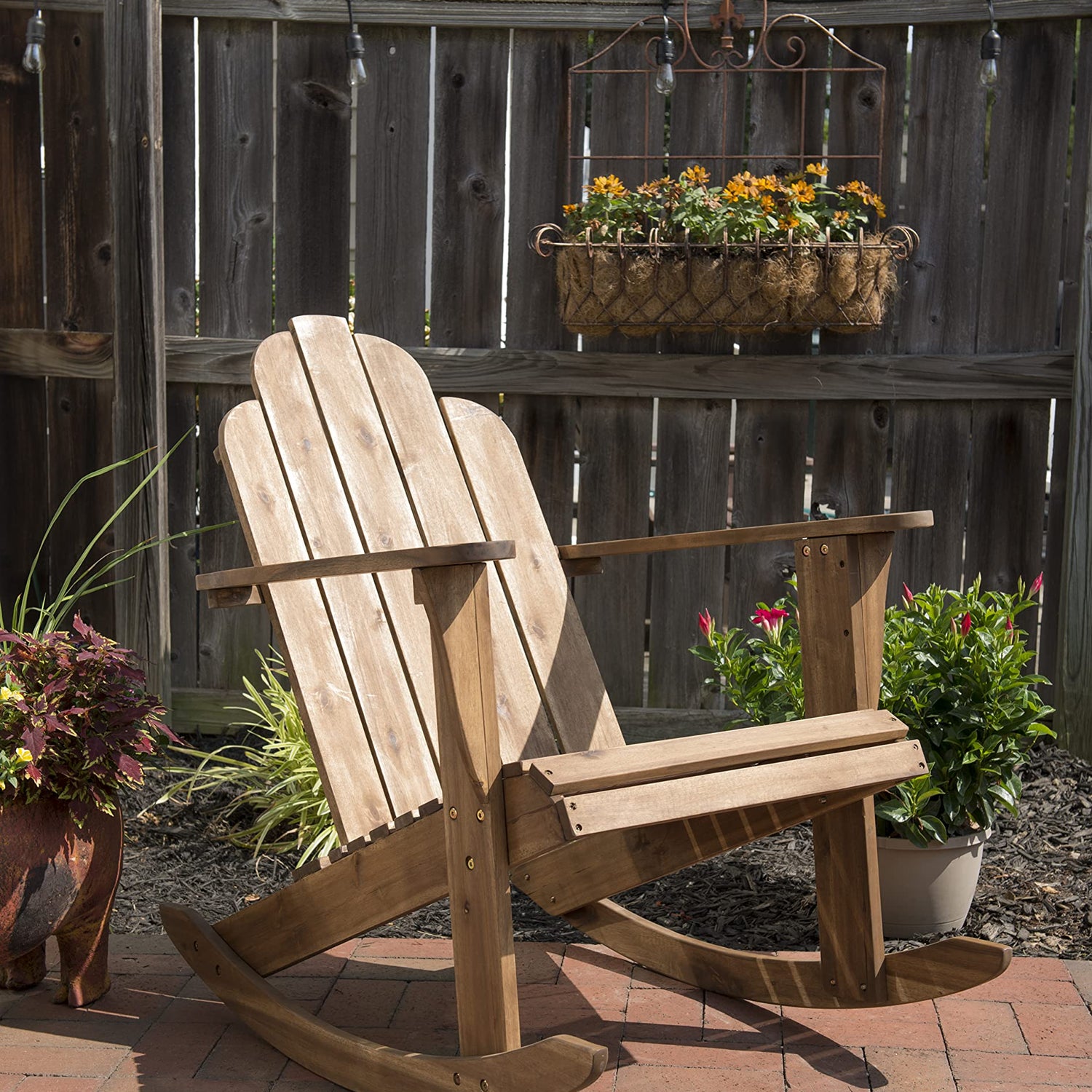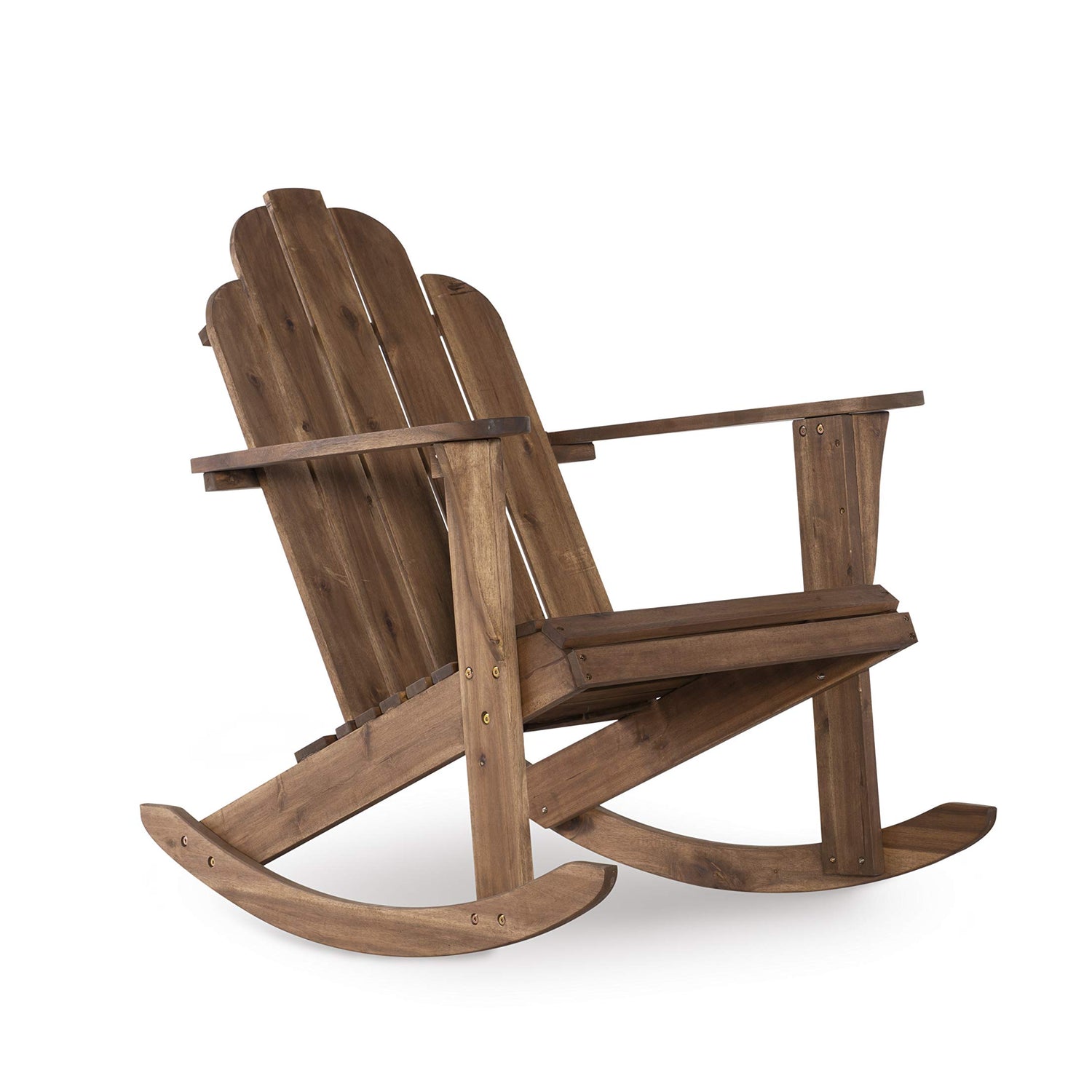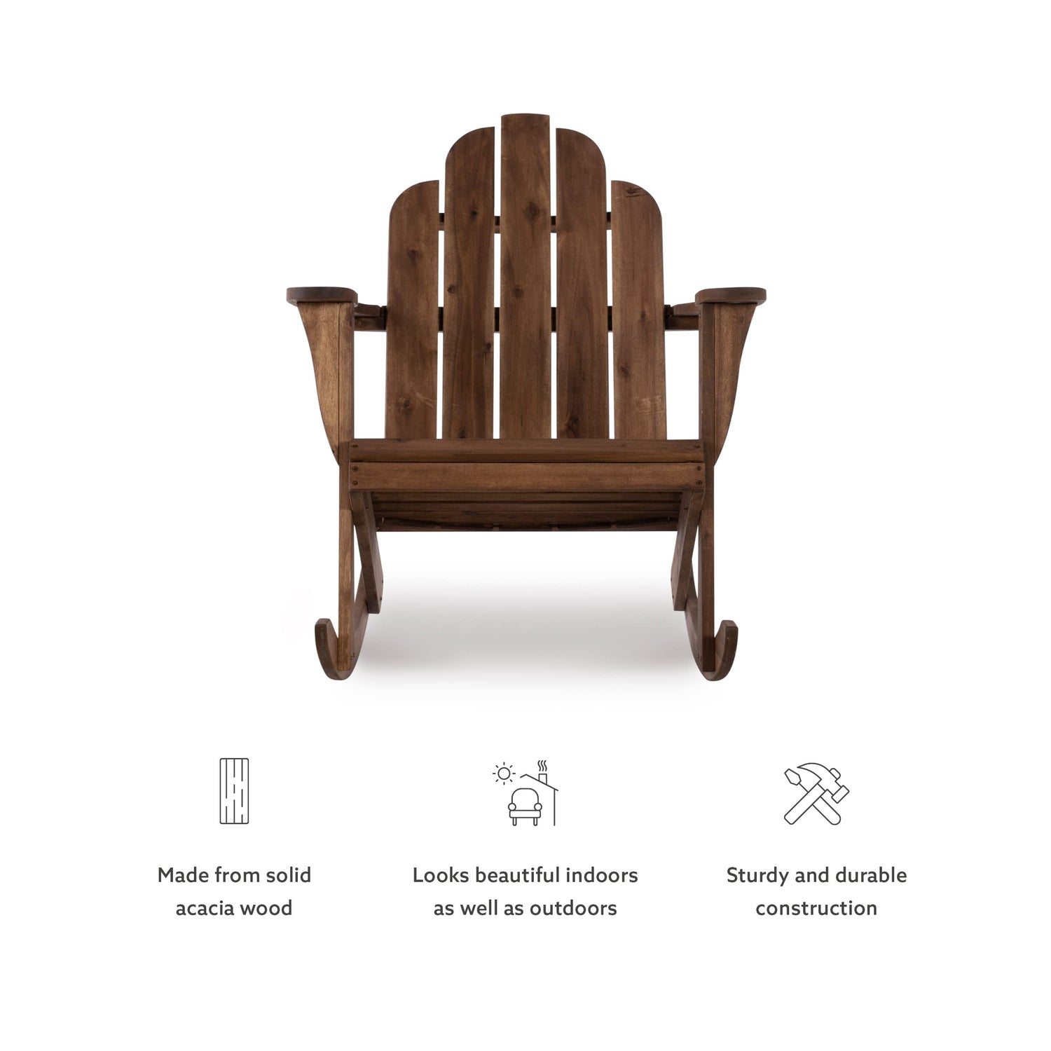 Details: The classic styled Adirondack Rocking Chair is the perfect complement to your outdoor area or poolside. The side armrests and high back provide comfort. Sturdy and durable, the acorn brown stain allows the piece to easily complement your outdoor space.