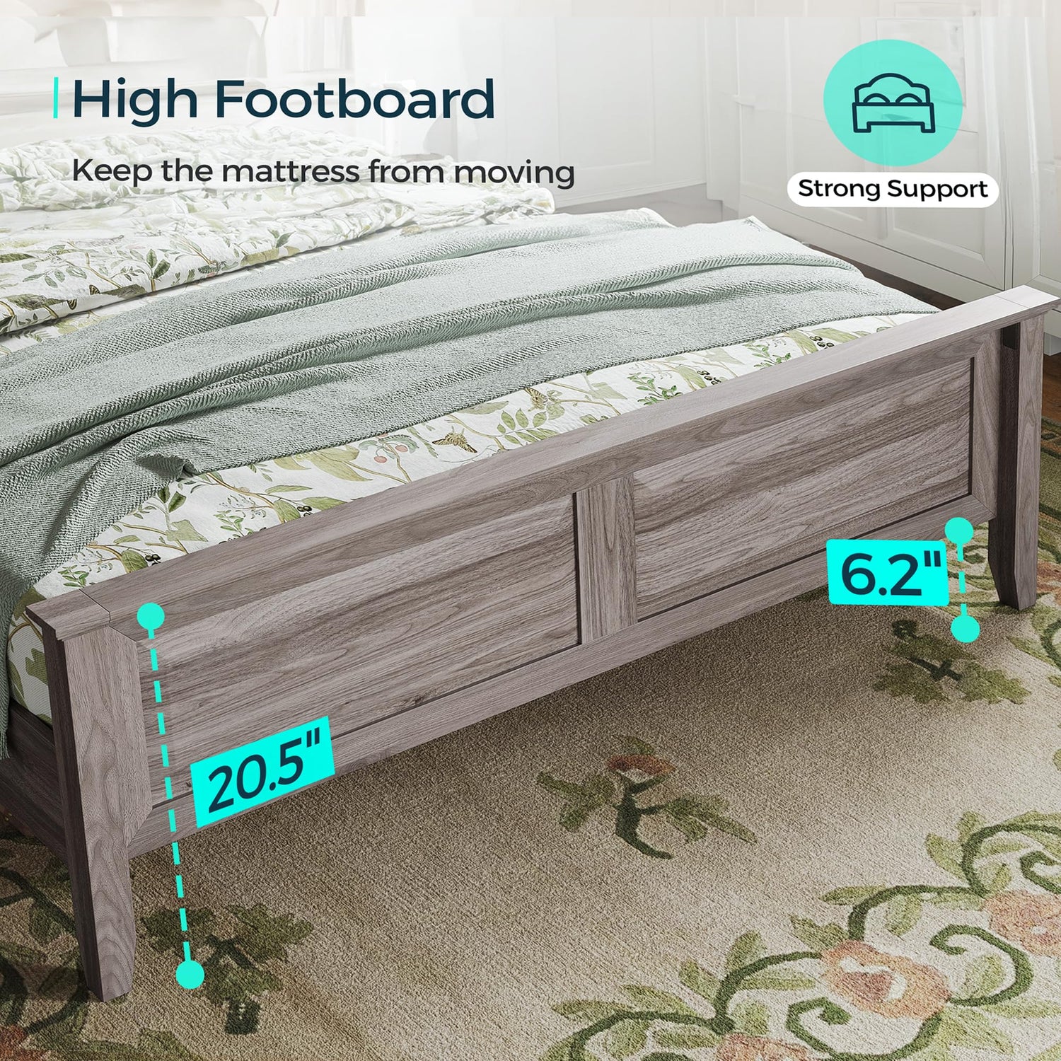 - * CLASSIC HIGH-FOOTBOARD DESIGN: The farmhouse bed frame features a 20.5" high footboard that not only enhances the structural stability of the frame but also offers visual harmony between the headboard and footboard, preventing mattress slipping. The embedded design prevents the mattress from sliding, ensuring stability while you sleep. Silent strips are designed to firmly fix the wood slats in place, reducing friction noise, squeak and creating a peaceful night's sleep environment for you.
