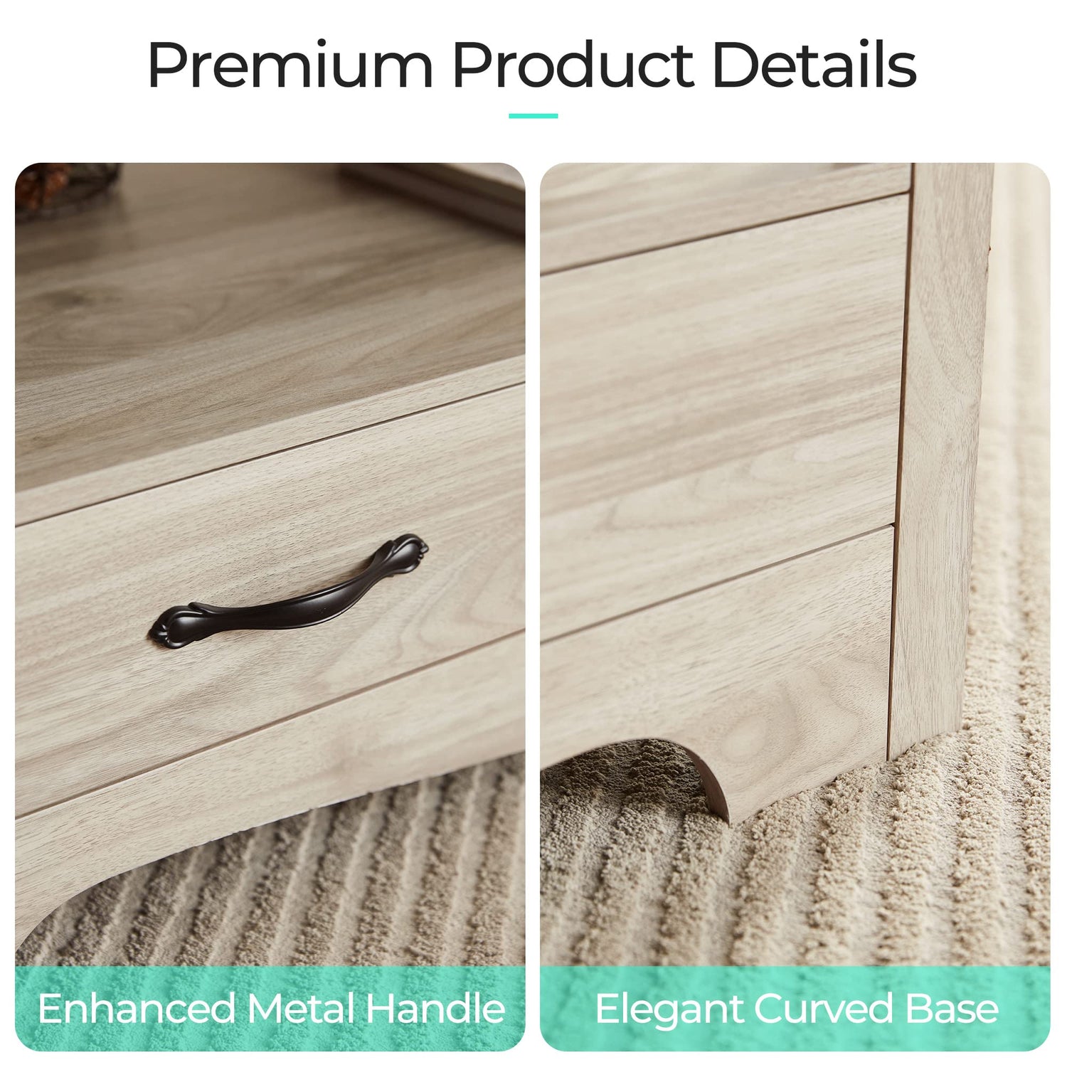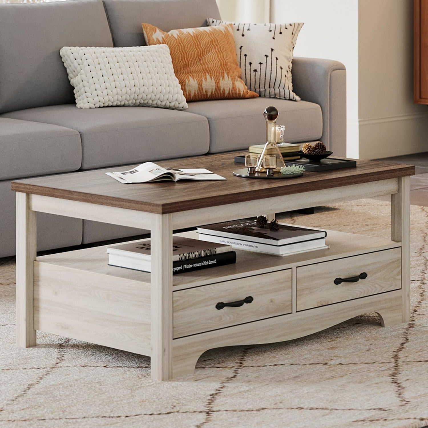 - CLASSIC FARMHOUSE DESIGN: This coffee table is adorned with a natural wood finish, an easy-to-match color and a high level of perfection in the details. Features a distinctive curved bottom that enhances the texture and visual depth of the space. Clean lines and metal handle design create a unique aesthetic, full of farmhouse rustic and modern. This table complements any style and decor. Its versatile design and beauty offer a simple yet ample organization and storage solution for your home.