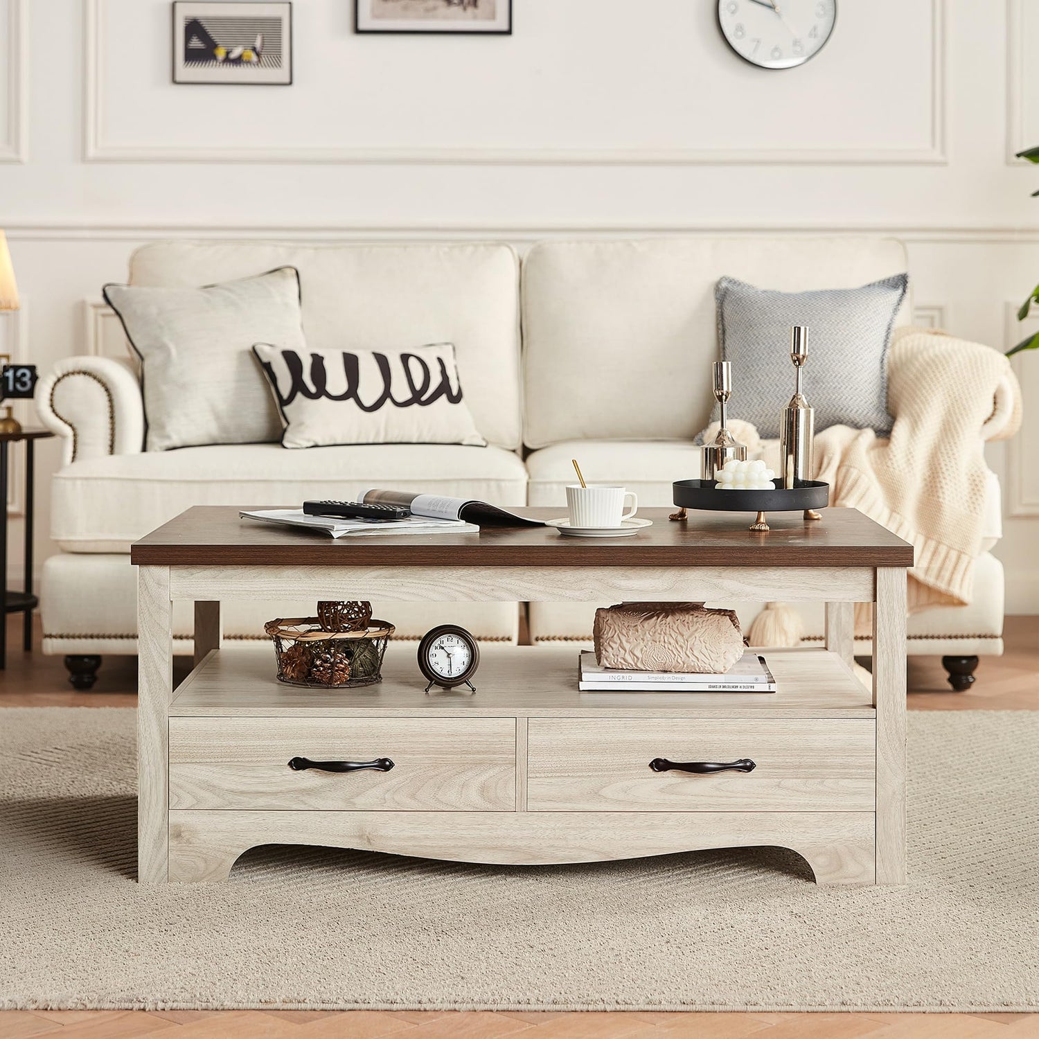 - SIZE: LINSY's brown and white coffee table with storage provides both function and style. Showcase your decor with the spacious surface, measuring 23.2''Dx41.3''Wx18''H, which can hold up to 275lbs in total and features metal handles for easy access to convenient storage solutions. The charming farmhouse appeal is enhanced by the durable construction, ensuring this rustic wooden coffee table will bring joy to your home for years to come.