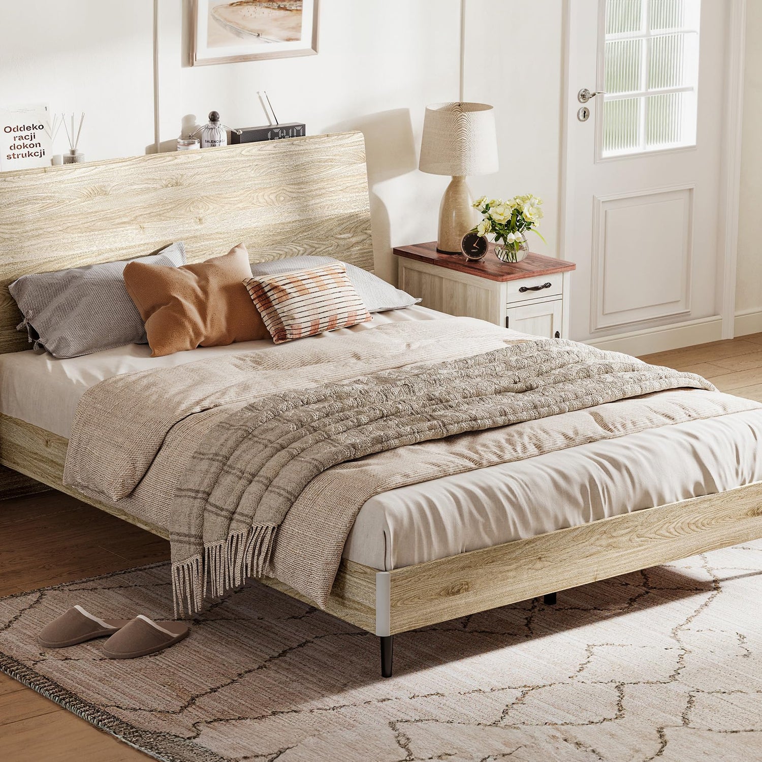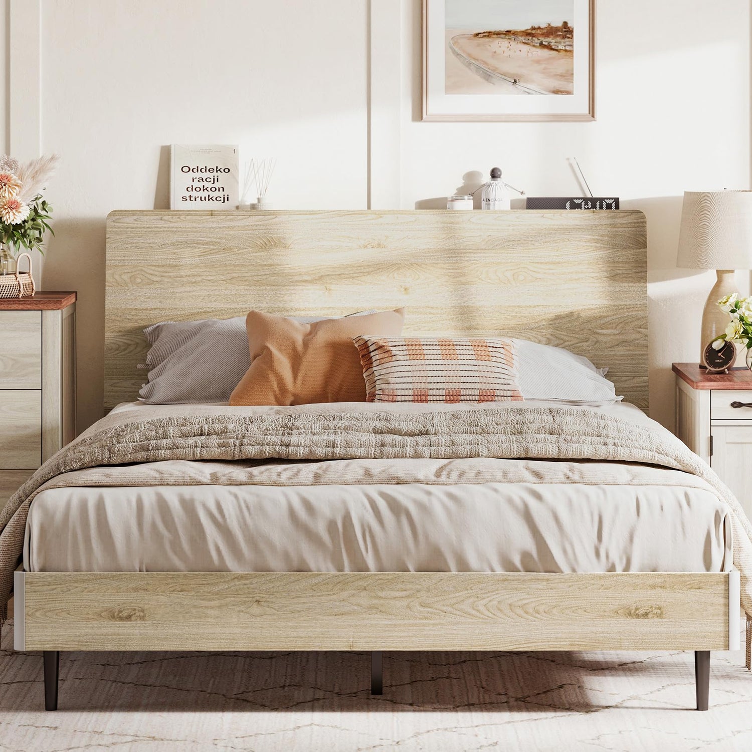 LINSY Beige Full Size Wood Platform Bed Frame with Ergonomic Headboard and Storage Shelf