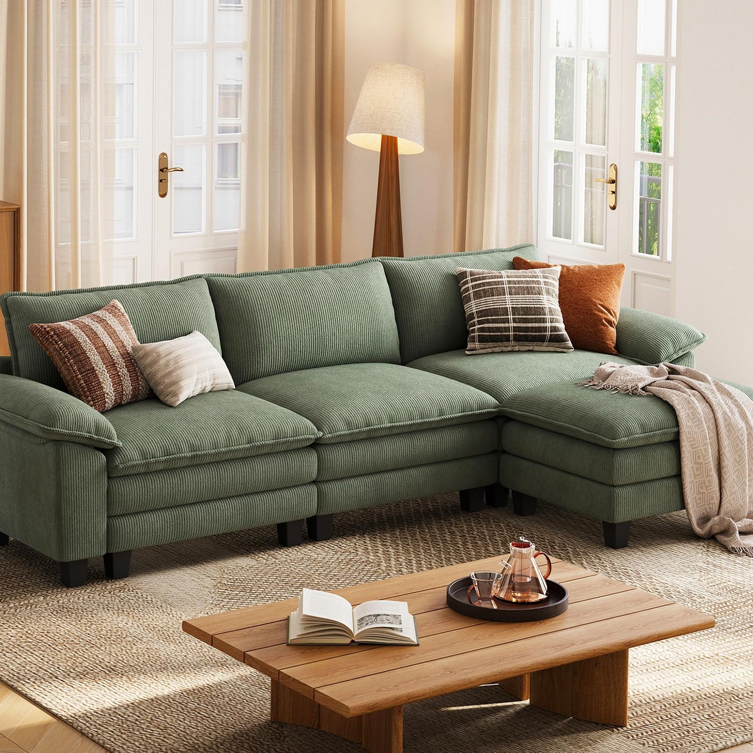 LINSY HOME 123'' Modular Sectional Sofa Green Couch Corduroy Cloud Couches for Living Room, L Shaped Couch with Movable Ottoman, Modern Cloud Sectional Sofas for Bedroom and Apartment, Green