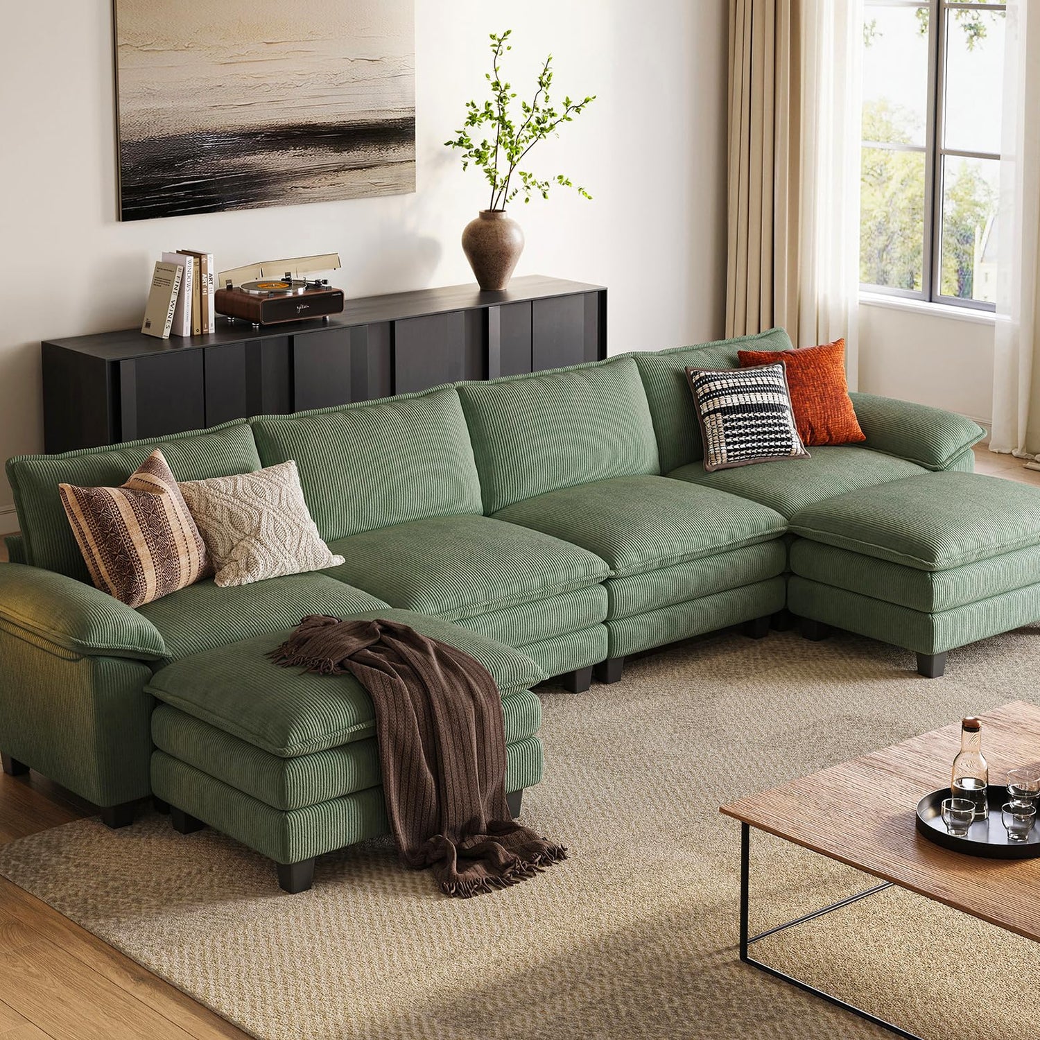 LINSY HOME 157'' Modular Sectional Sofa Green Couch Corduroy Cloud Couches for Living Room, U Shaped Couch with Movable Ottoman, Modern Cloud Sectional Sofas for Bedroom and Apartment, Green