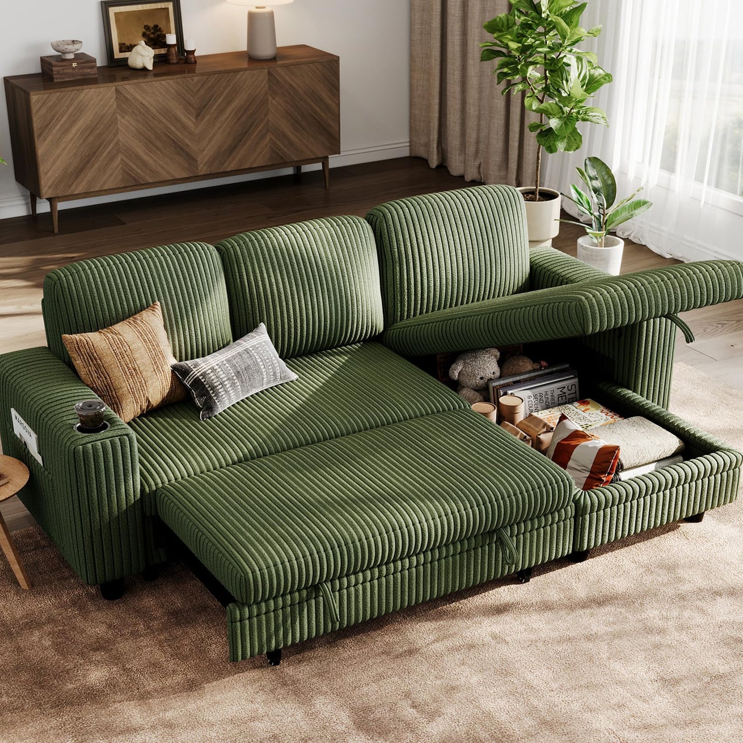 LINSY HOME Sectional Sleeper Sofa with Pull Out Couch Bed Convertible Plush Corduroy Cloud Couch with Storage Chaise & USB Charging, Comfy L Shaped Modular Couches for Living Room Apartment (Green)
