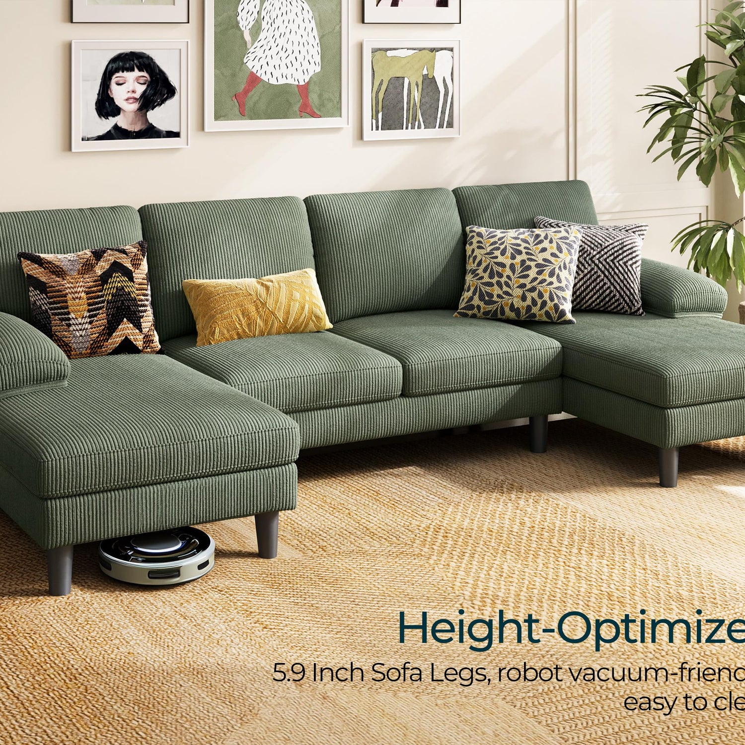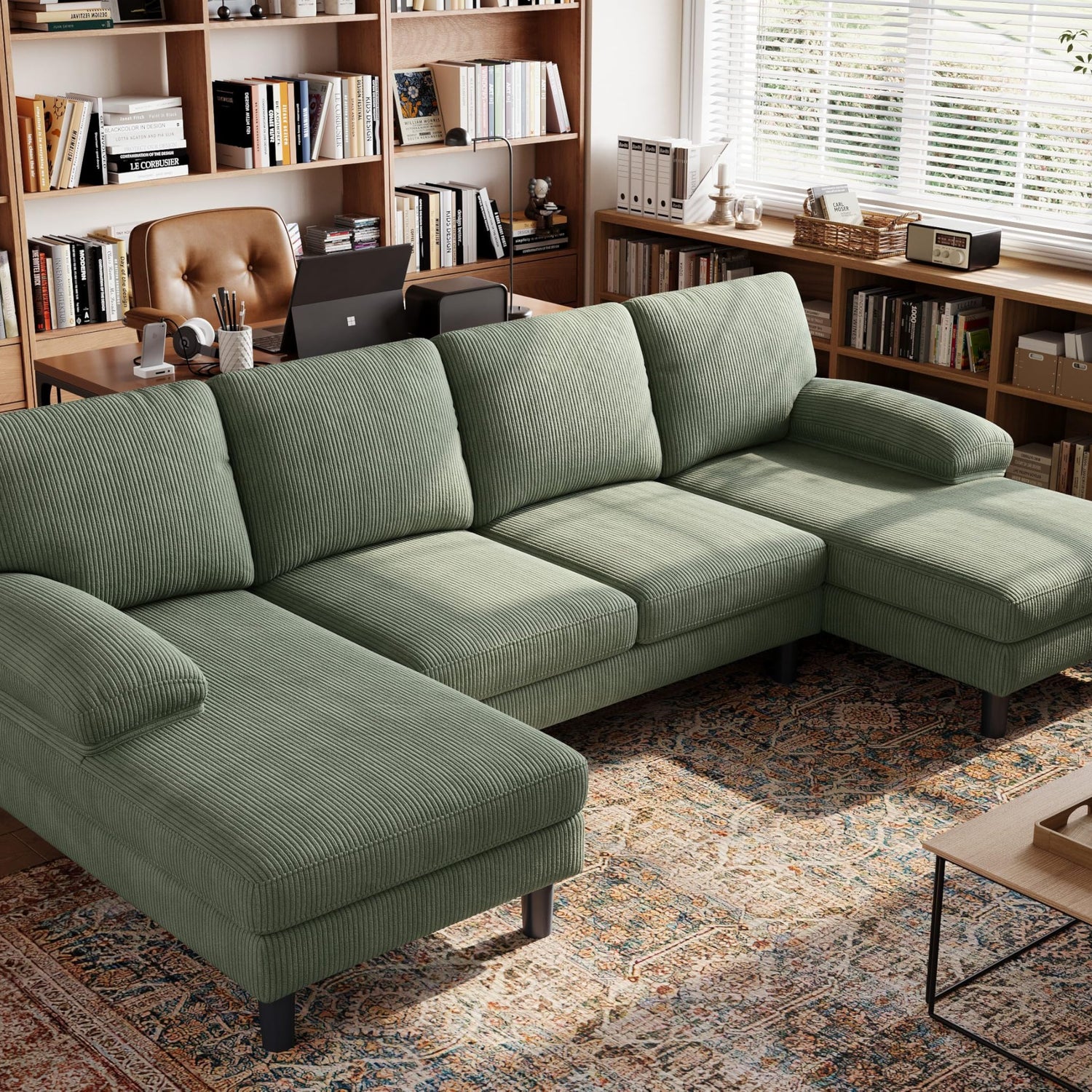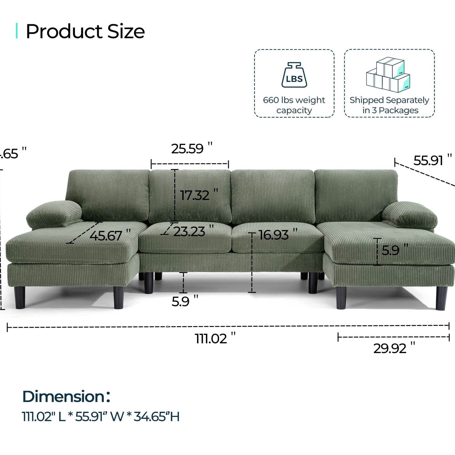 LINSY HOME U Sectional Couch, 111'' W Corduroy Sofa with Sleepable Armrests, 4 Seat Couch with Double Chaises, Deep Sofa for Living Room, Army Green