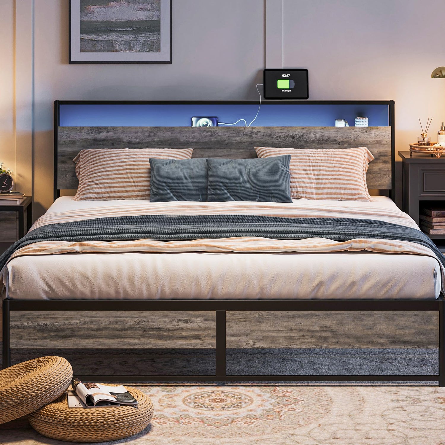 LINSY Ergonomic King Size Bed Frame with Storage Headboard, Charging Station & LED Lights