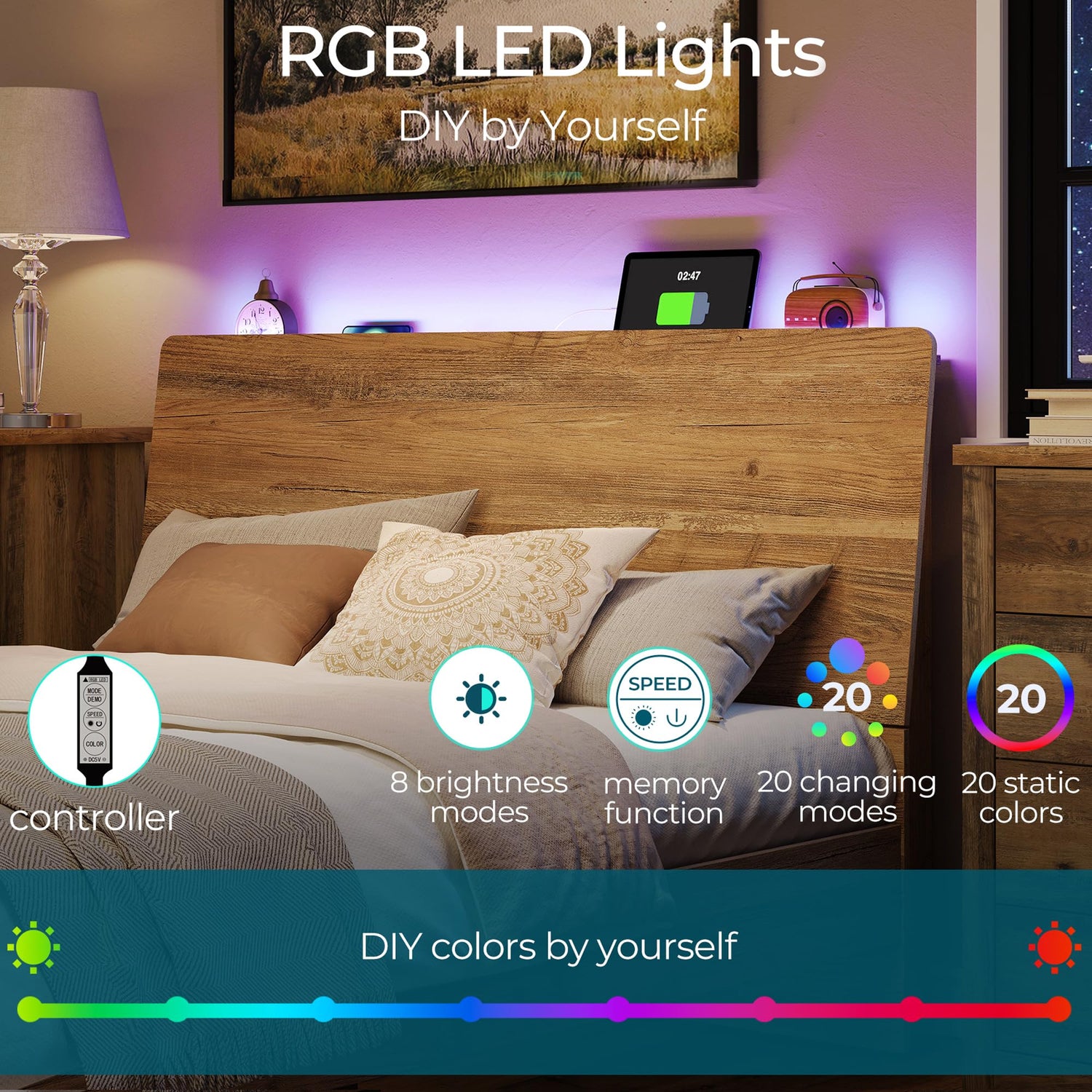 - RGB LED LIGHT & CHARGING STATION: This bed frame supports the headboard RGB LED light. The light supports 20 vibrant colors, 8 brightness levels, and 20 dynamic modes. The controller is installed on the headboard, convenient to change the light when you are lying on the bed, you can easily set the perfect atmosphere for any occasion. The built-in charging station includes AC outlet, USB port, and Type-C port, making it easy to charge your devices while lying in this bed, no worry about the low!