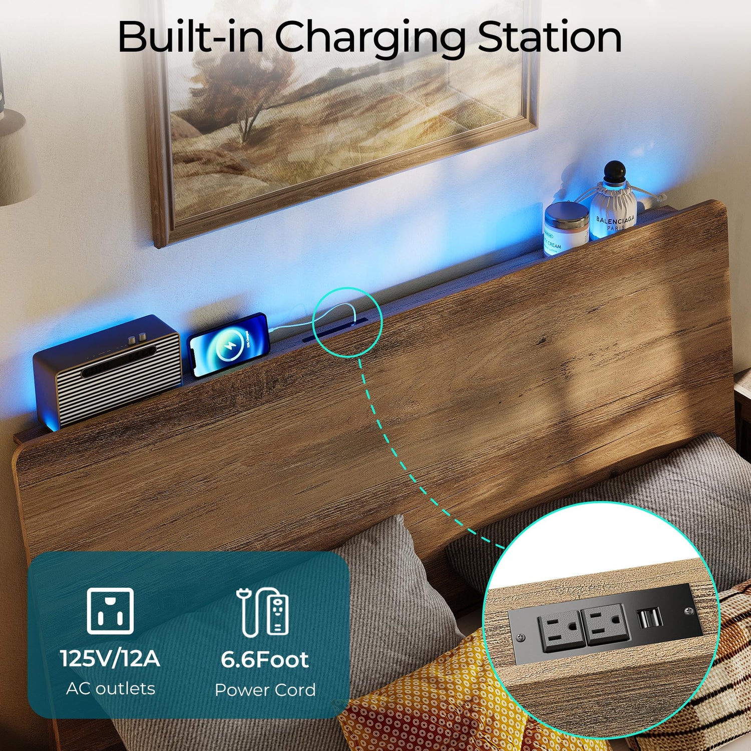 LINSY Wood Bed Frame, Full Bed Frame with Headboard LED, Wooden Platform Frames with Charging Station, No Box Spring Needed, Easy Assembly, Rustic Brown