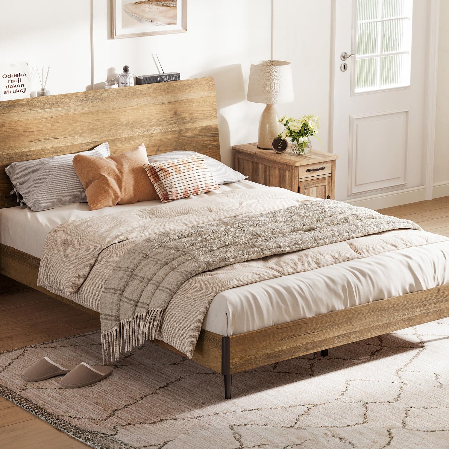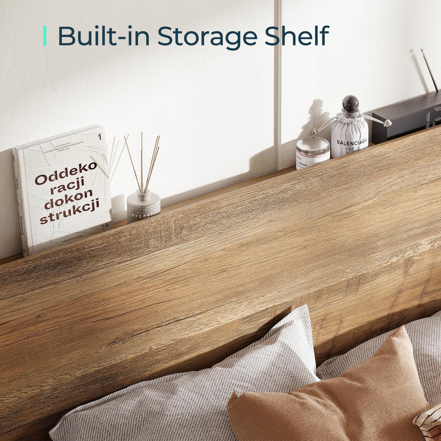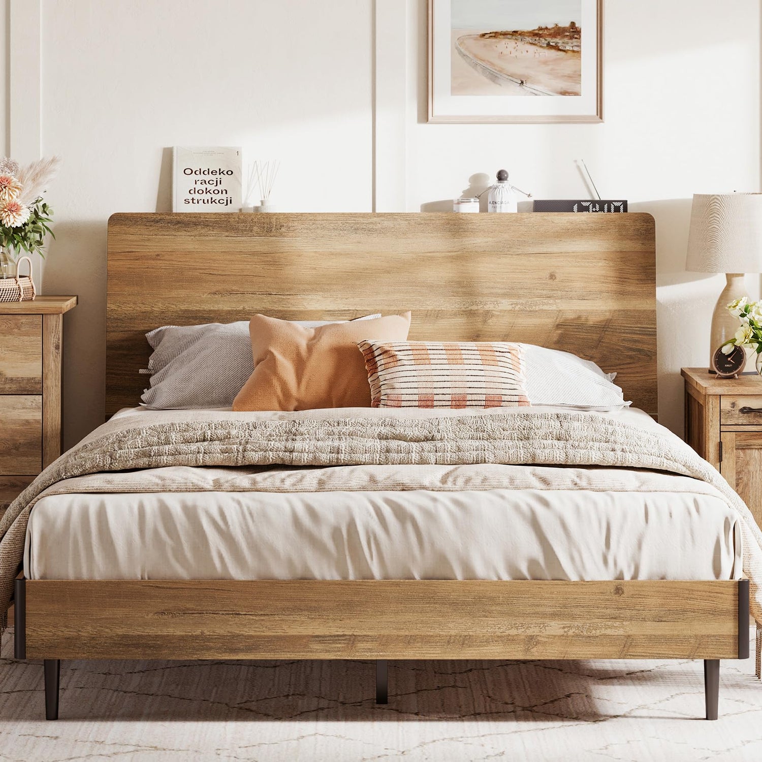 LINSY Wood Full Size Bed Frame with Ergonomic Headboard, Farmhouse Beds Frame Full with Storage Shelf, 45-Min Fast Assembly Wood Bed Full, Noise-Free, No Box Spring Needed - Brown