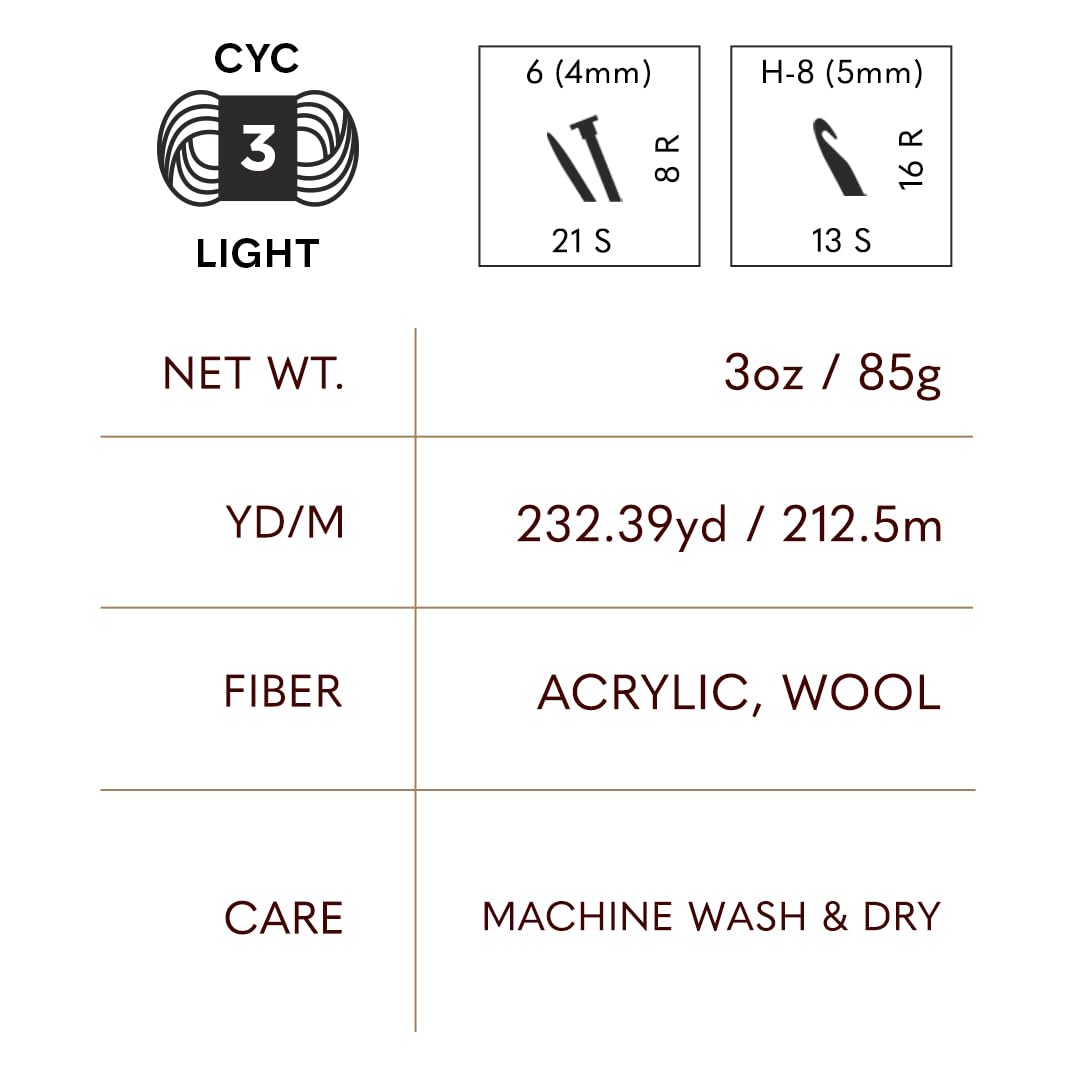 - FIBER COUNT: This crochet yarn is made from 80% acrylic and 20% wool fibers. It is rated a CYC #3 light/DK making it a great choice for sweaters, afghans and more.
