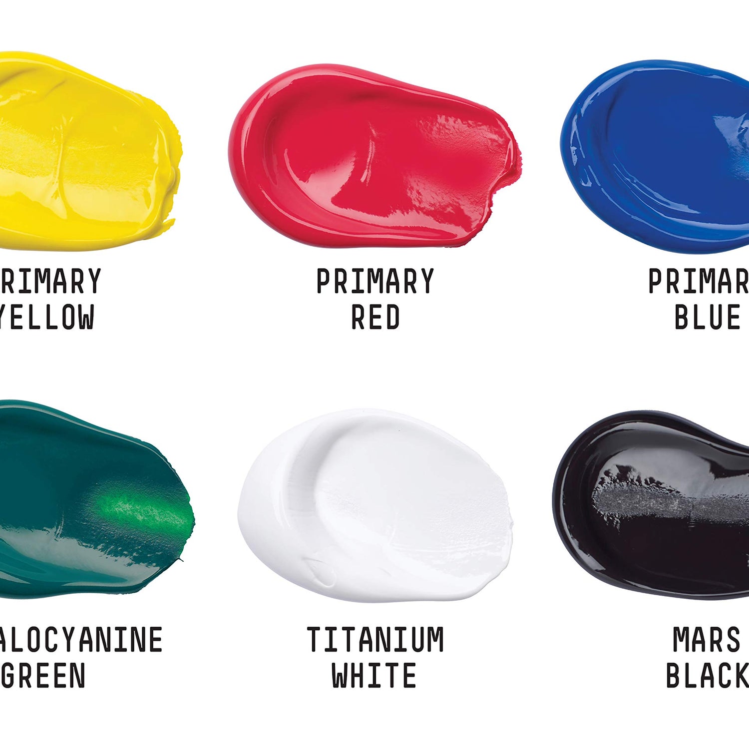 - SET INCLUDES - Six 22ml (0.74oz) tubes. Primary Yellow, Primary Red, Primary Blue, Phthalocyanine Green, Titanium White, and Mars Black