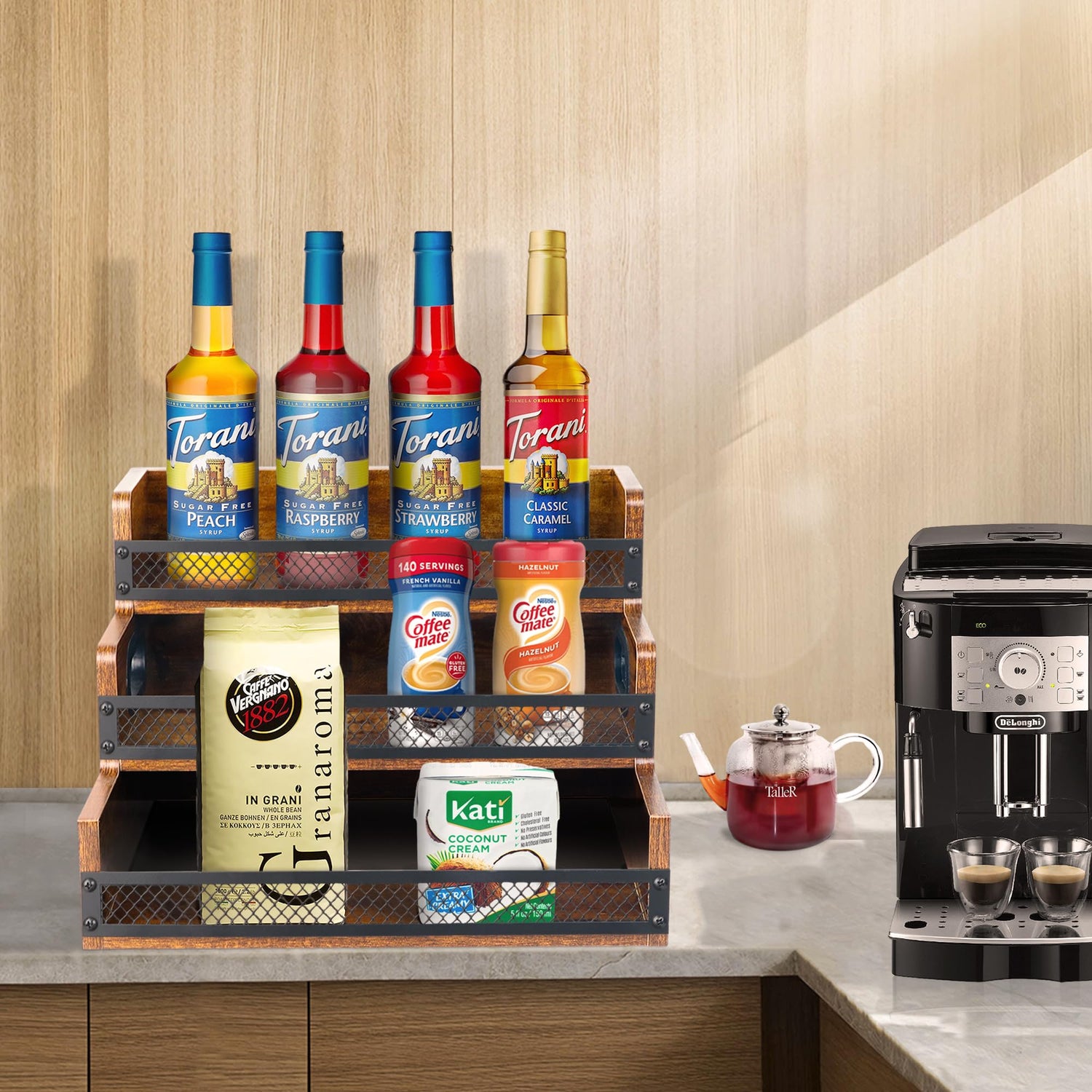 - 【Sturdy & Durable】The coffee syrup stand is made of sturdy wood, which has smooth surfaces without worrying about stabbing hands. The height between each tier is carefully designed to ensure that you can use the syrup pump while the bottle is on the syrup stand for coffee bar.
