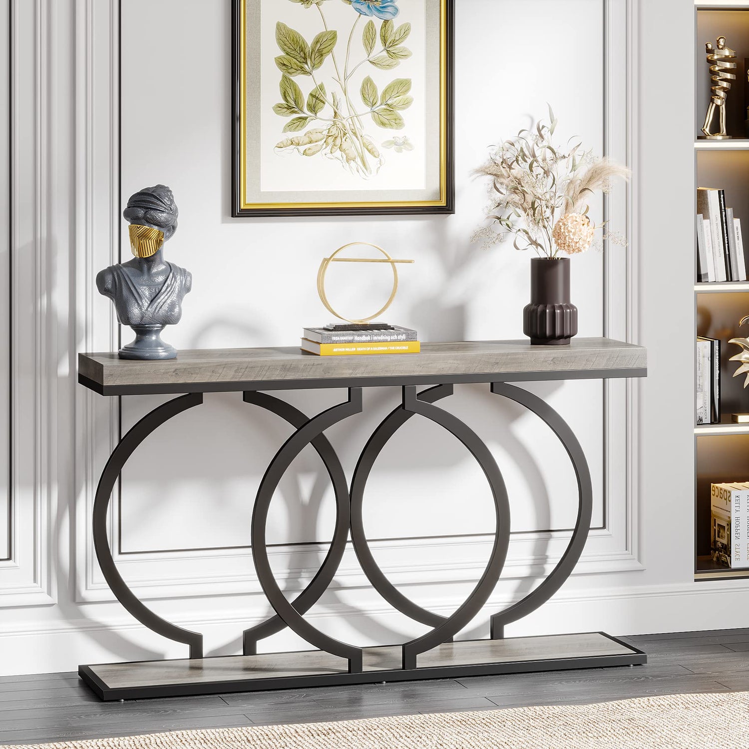 - Elegant Design - Add a touch of glamour to your home with this stunning grey entryway table. The black metal base features an O-shaped symmetric circular design with three loops that add an interlocking visual effect, creating a unique artful look