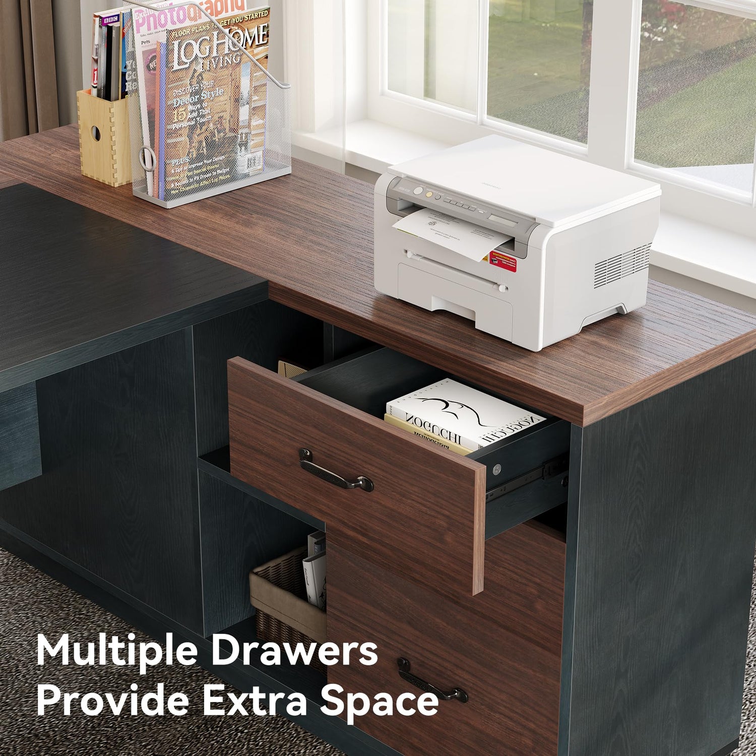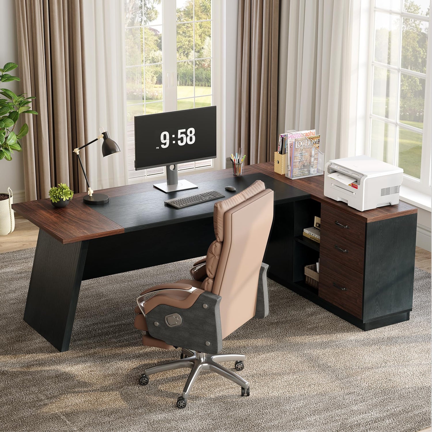 LITTLE TREE 78-Inch Executive Office Desk with File Cabinet, Large Modern Corner Office Desk for Home Office, 3-Drawer Wood File Cabinet, Spacious Workstation for Home Office (Brown & Black)