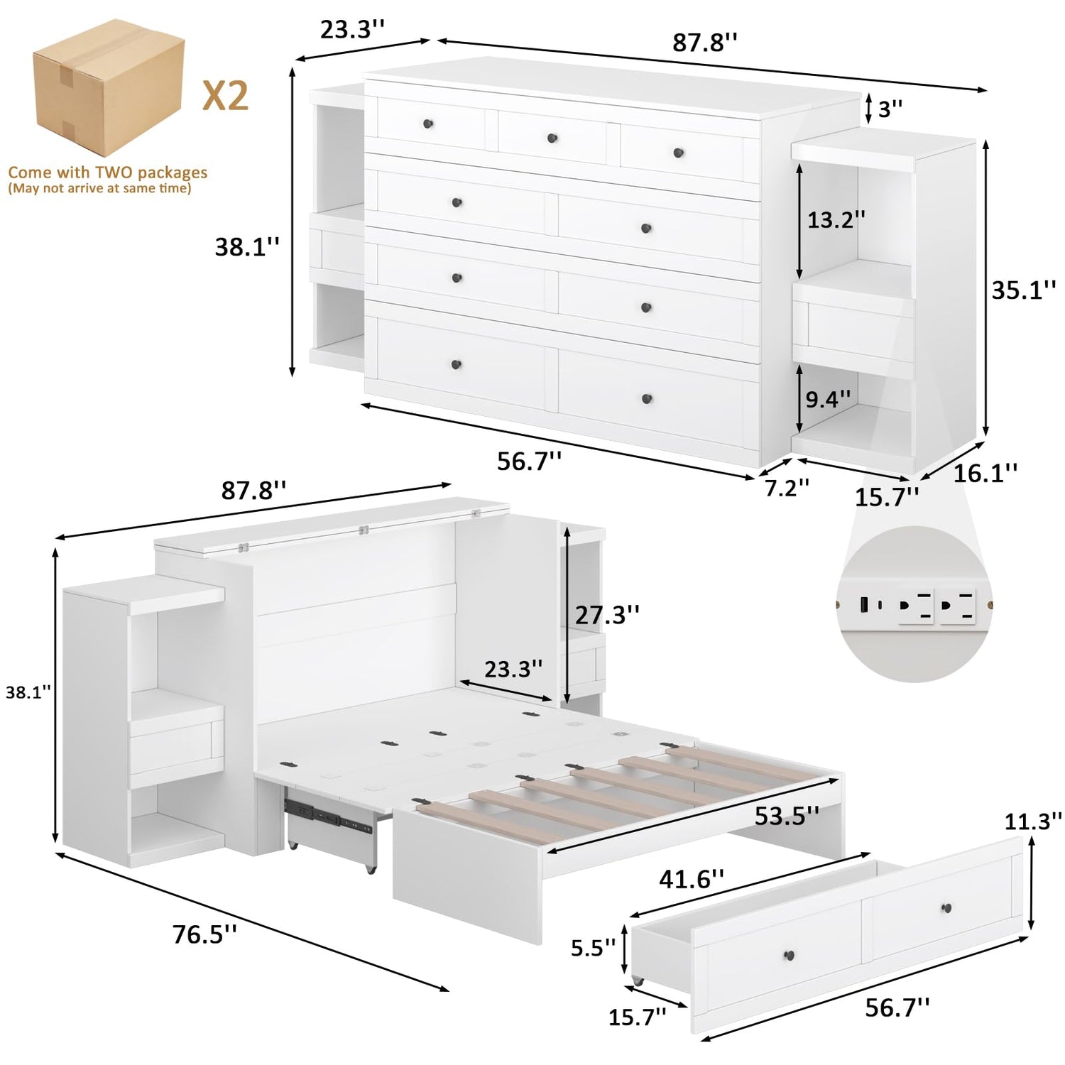 Details: Full Size Murphy Bed with Bedside tables,Full Size Foldable Cabinet Bed Frame with Charging Station & Drawer,Murphy Bed Chest with Adjustable LED Light for Bedroom,Guest Room ,White