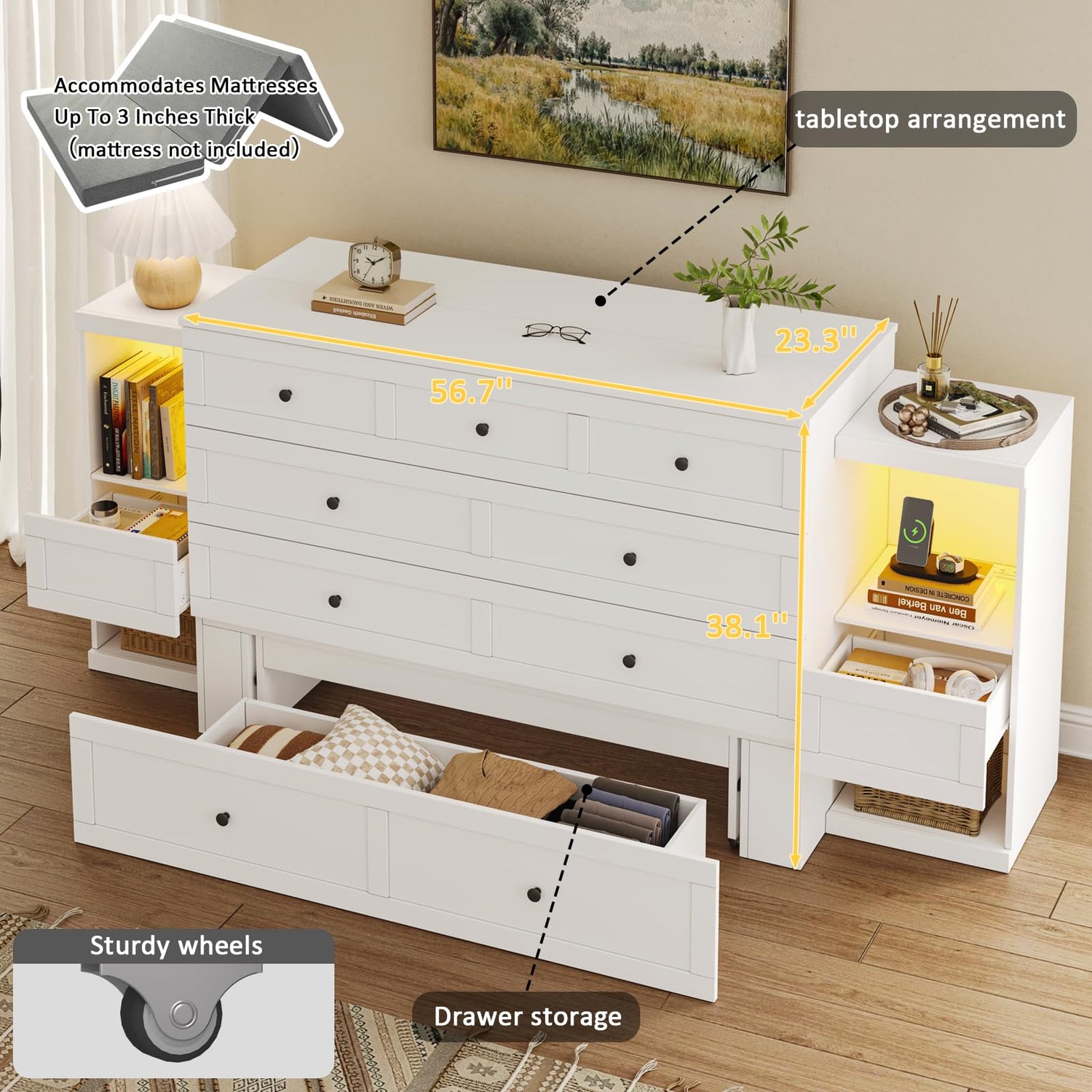 - 【Space-Saving with Ample Storage】 When folded, the Murphy bed transforms into a compact cabinet that fits neatly in your bedroom, guest room, or office without taking up much space. The upper section accommodates a tri-fold full-size mattress (up to 3 inches thick), while the lower section includes a large drawer for bedding or other items. Note: Mattress not included.