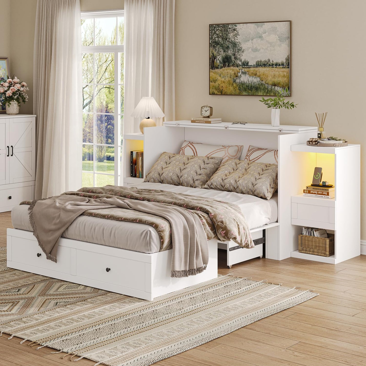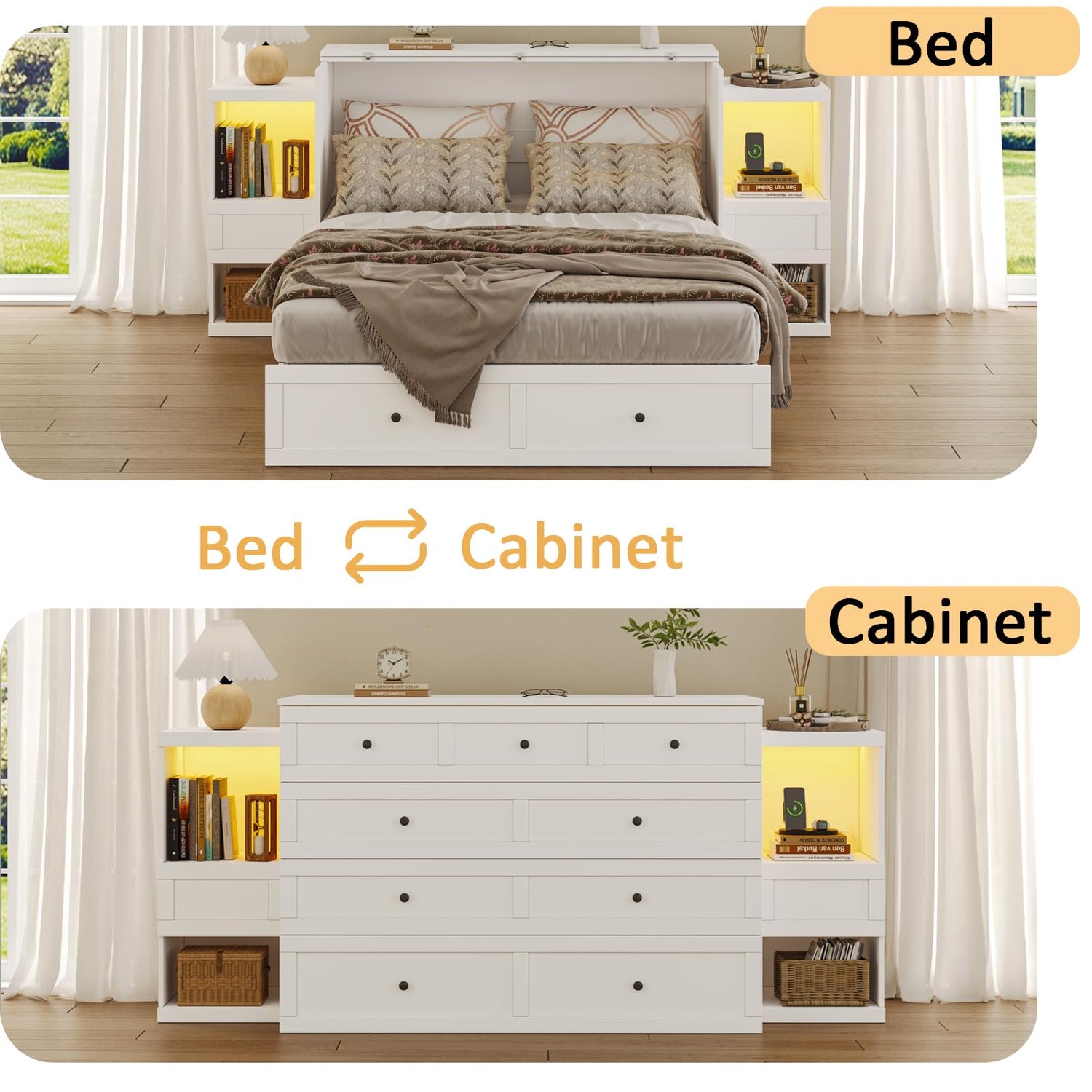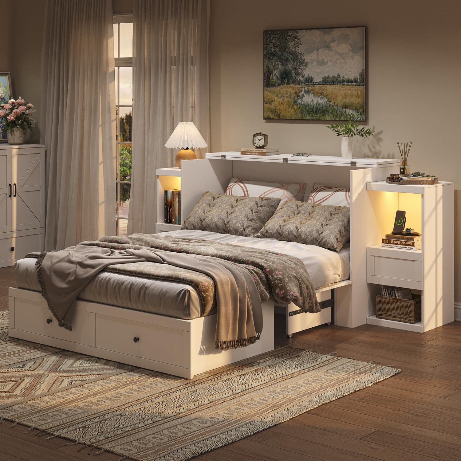 - 【Bedside Tables on Both Sides】 This Murphy bed includes a built-in bedside table on each side for added convenience. Each table features two open shelves for books, décor, or daily essentials, plus a spacious drawer that slides smoothly for easy storage. Cable management holes on the side panels help keep cords tidy and out of sight. Together, they offer organized storage and a clean, modern look for your space.