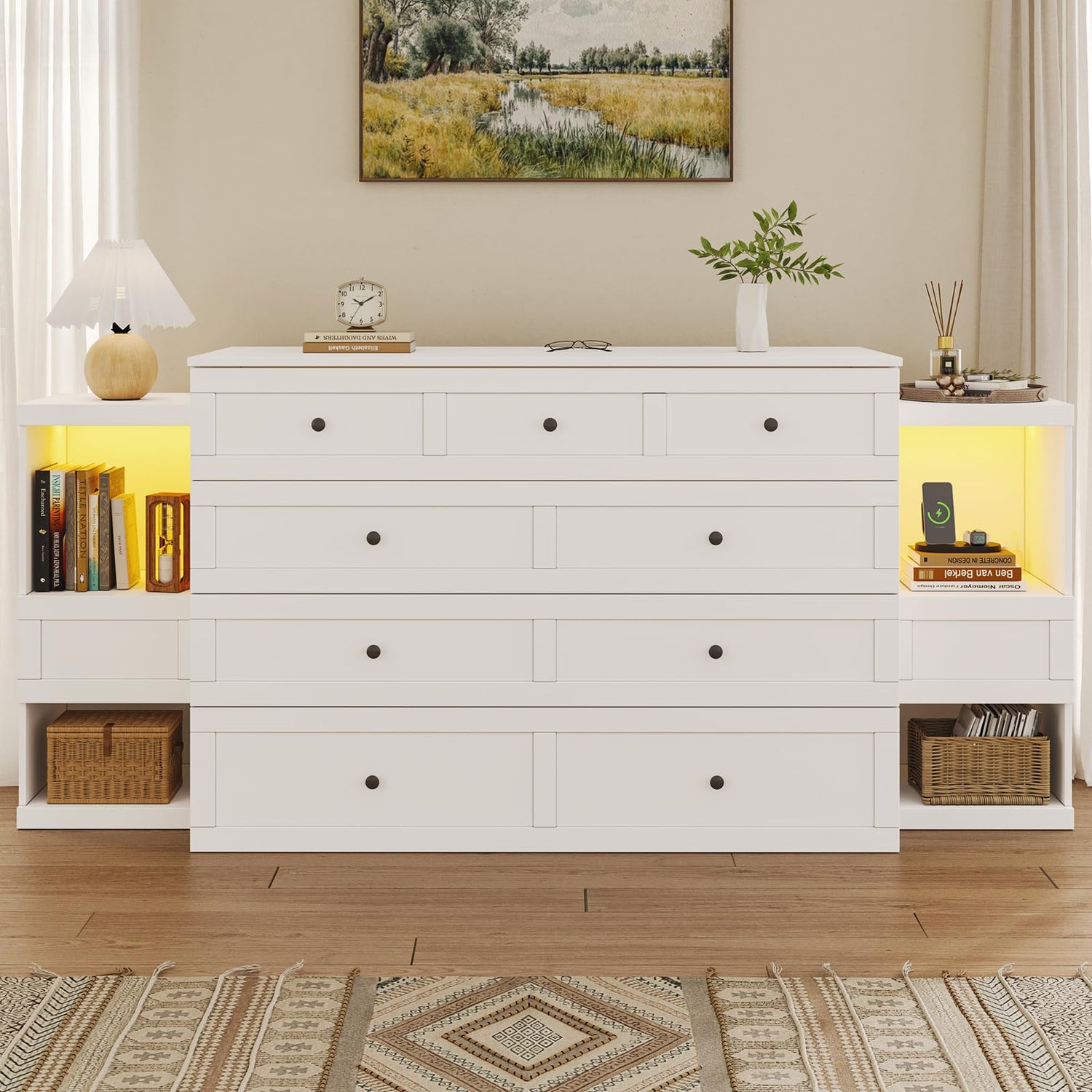 - 【RGB LED Light Strip】 Each bedside table is equipped with a soft, multi-color RGB LED light strip along the top. The lighting color, brightness, and mode can be adjusted to suit your preferences, allowing you to create a cozy and personalized atmosphere in your bedroom or guest room.