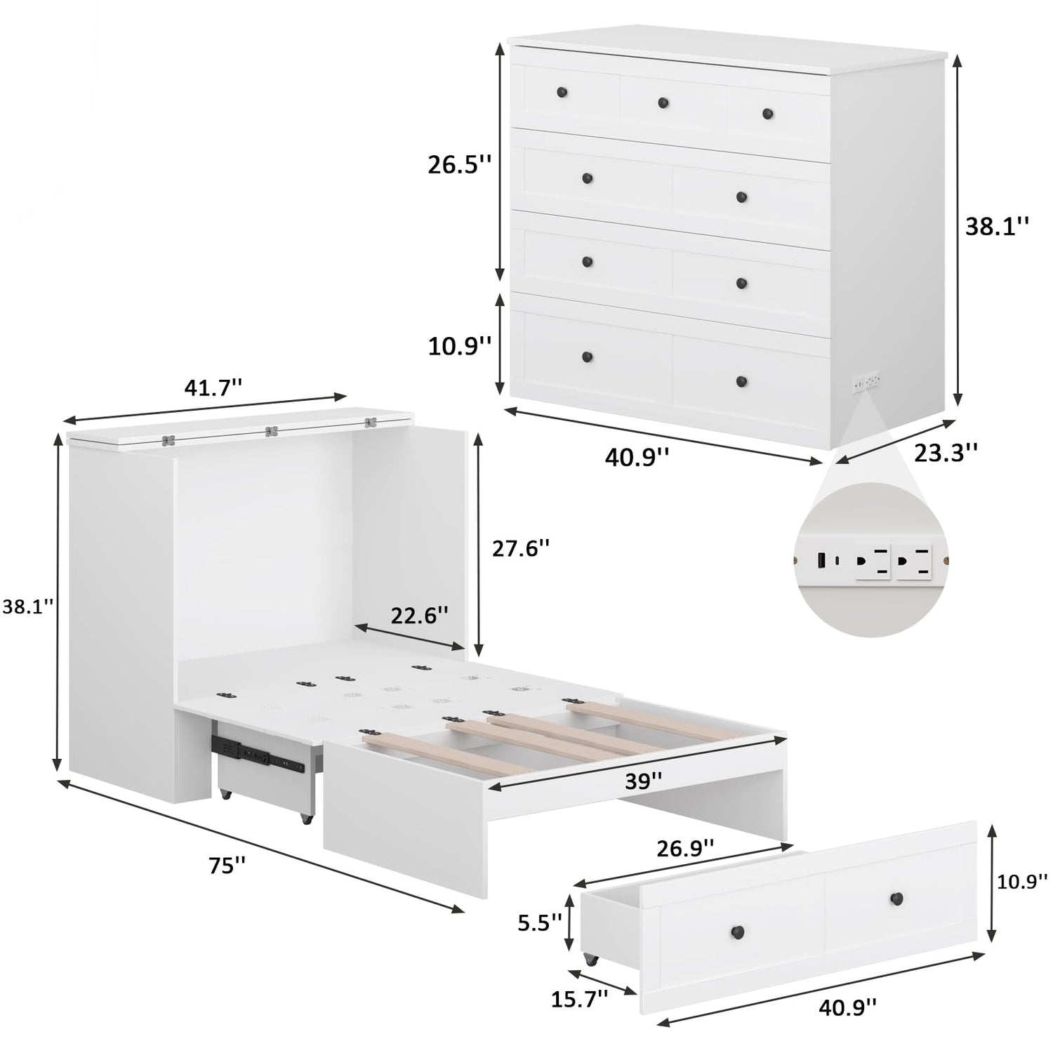 LIVAUVEAD Twin Murphy Bed with Built-in Charging Station, Space-Saving Murphy Bed Chest Twin with Drawer, Foldable, for Home Office Guest Room Bedroom White