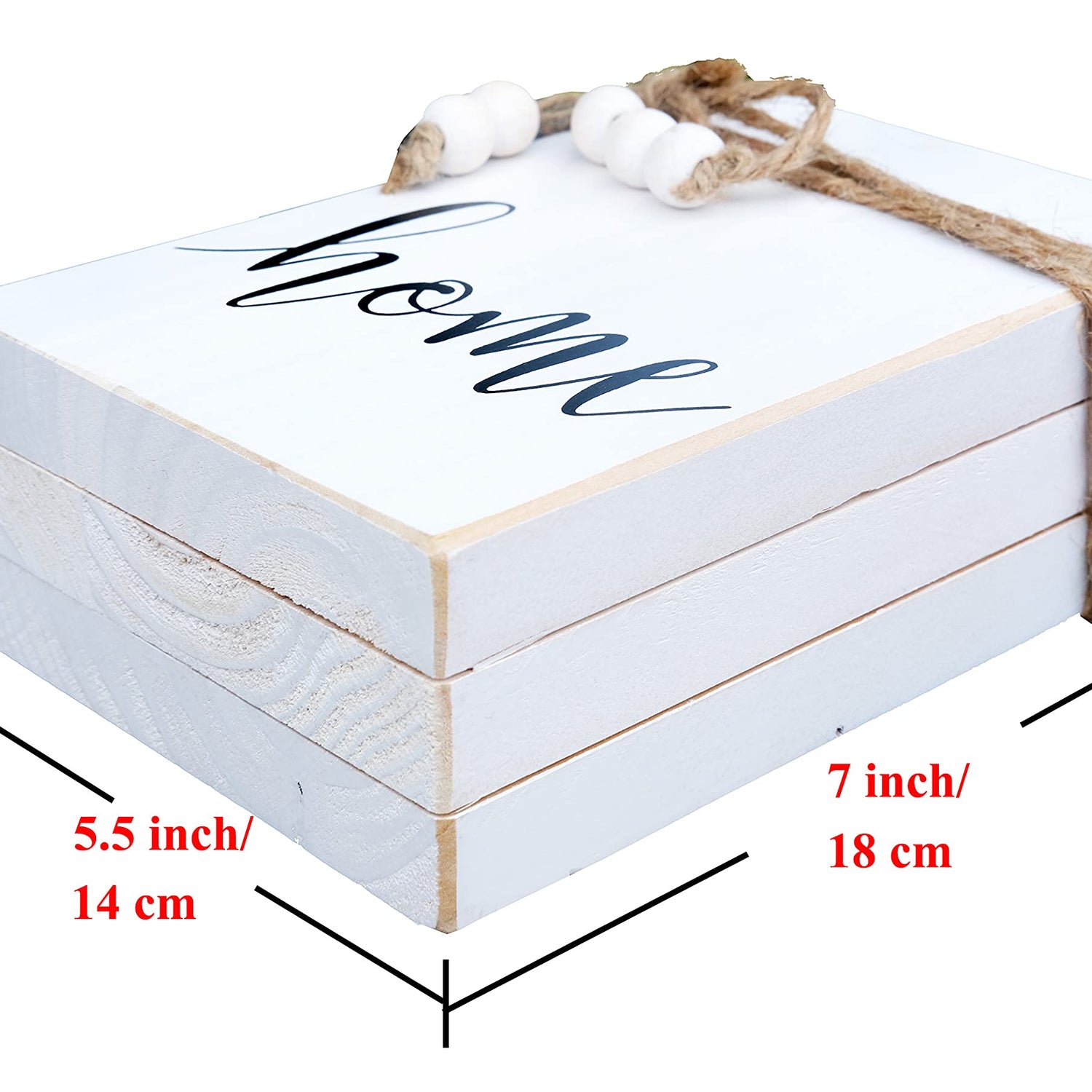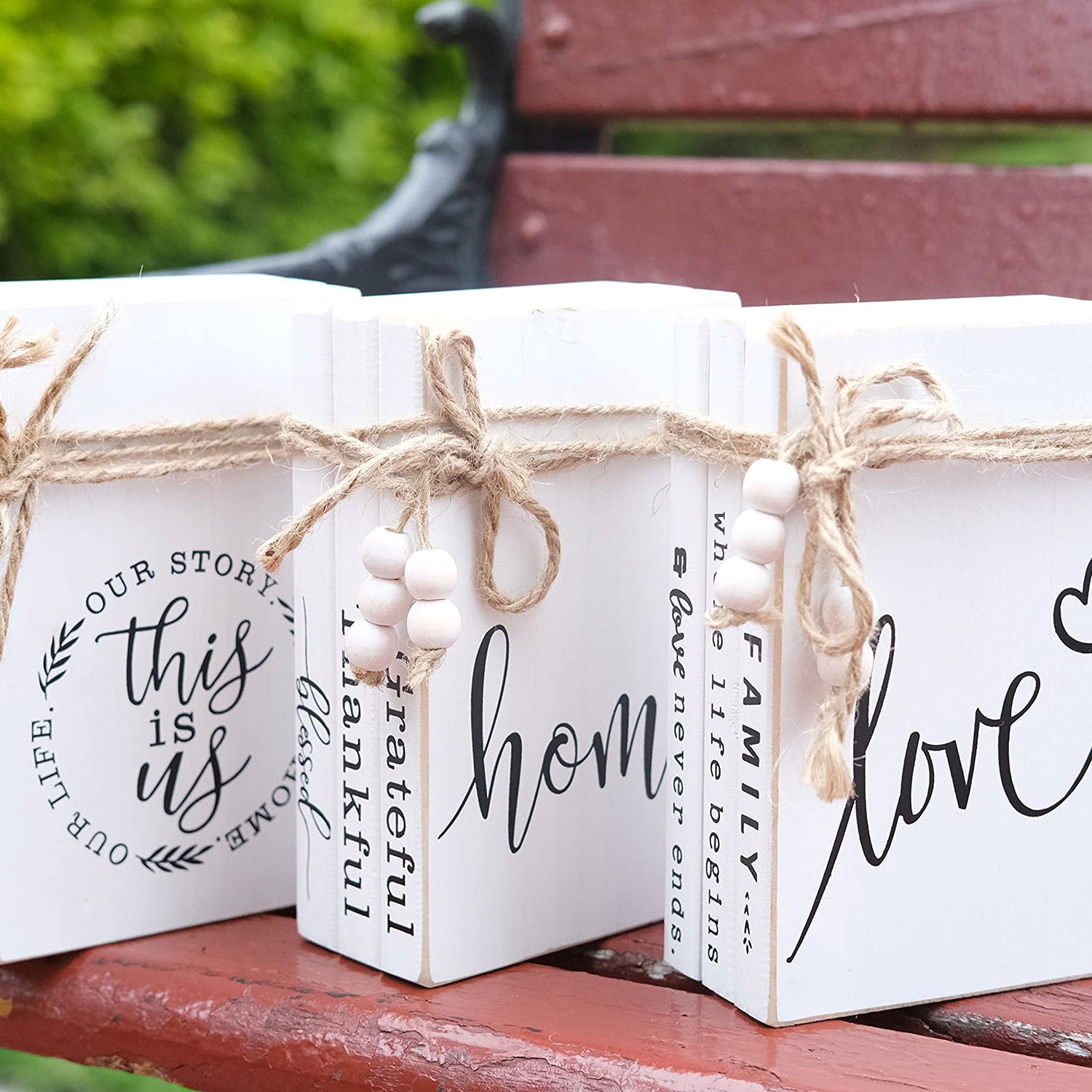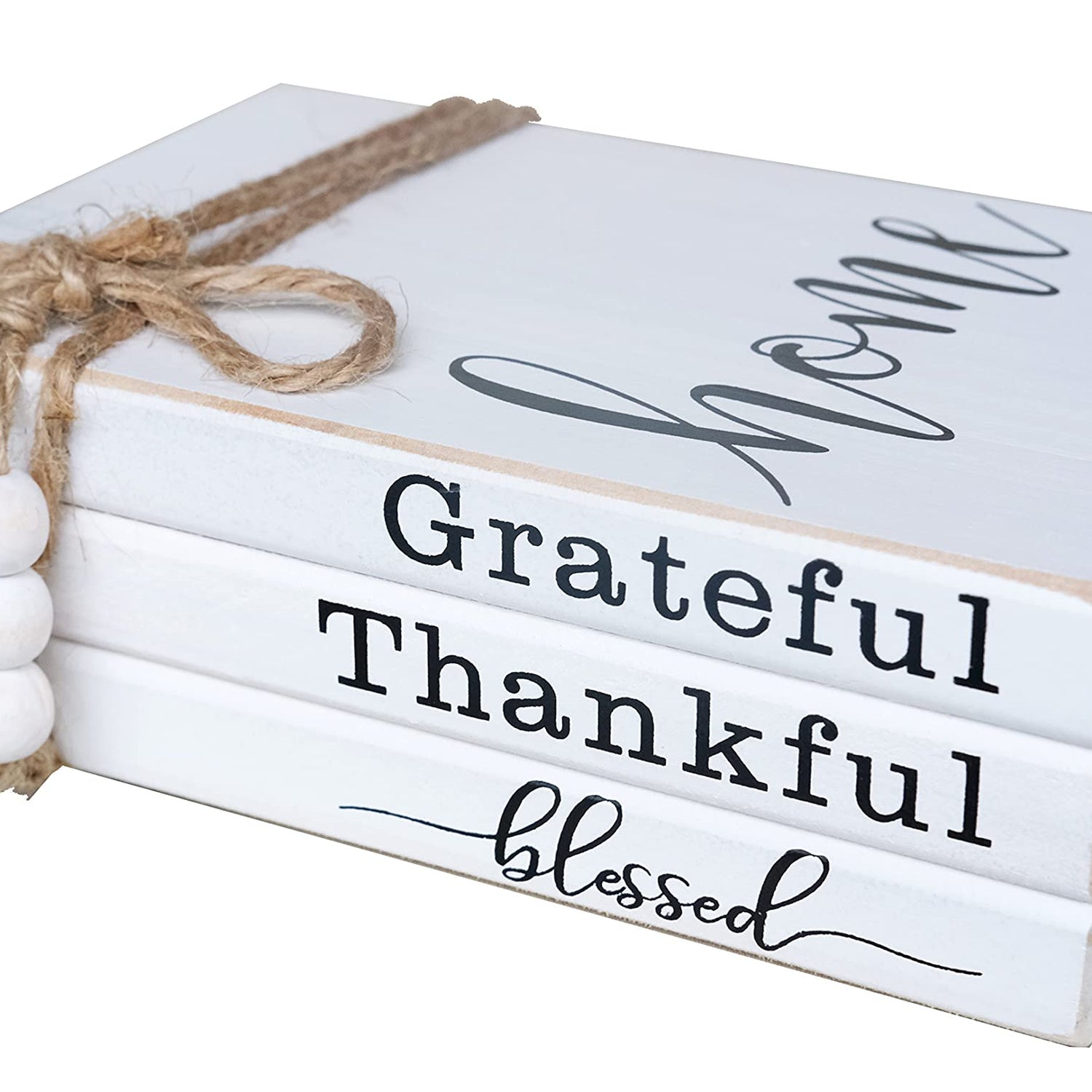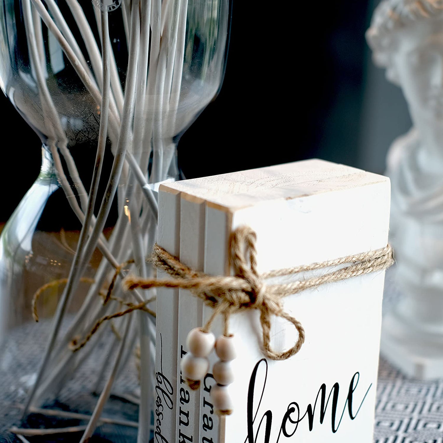 - 【HANDCRAFTED WOOD BOOK STACK】This farmhouse stacked books decor consists of 3 books made of solid cedarwood. White painted with slight distressing finish. Cute "home" printed on top book face, while books' spine has warm inspirational quote "Grateful Thankful blessed". 3 farmhouse wood books glued together, won't move to get loose, bookstack bound with rustic twine,the hemp rope's ends are threaded with white wood beads.