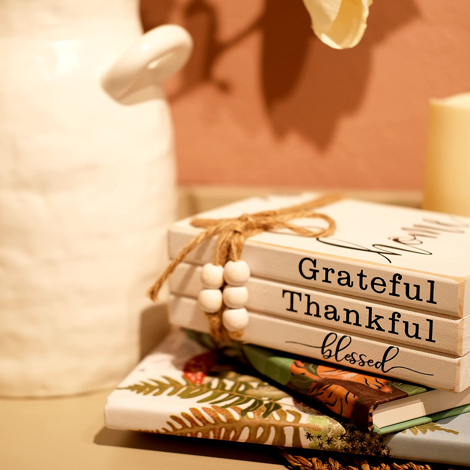 LIVDUCOT Wooden Farmhouse Decor Book Stack | Faux Book Stacks | Set of 3 Stacked Books for Coffee Tables Book Shelf Decor | Grateful Thankful Blessed Home Sign 7'x 5.5'x 2.5'