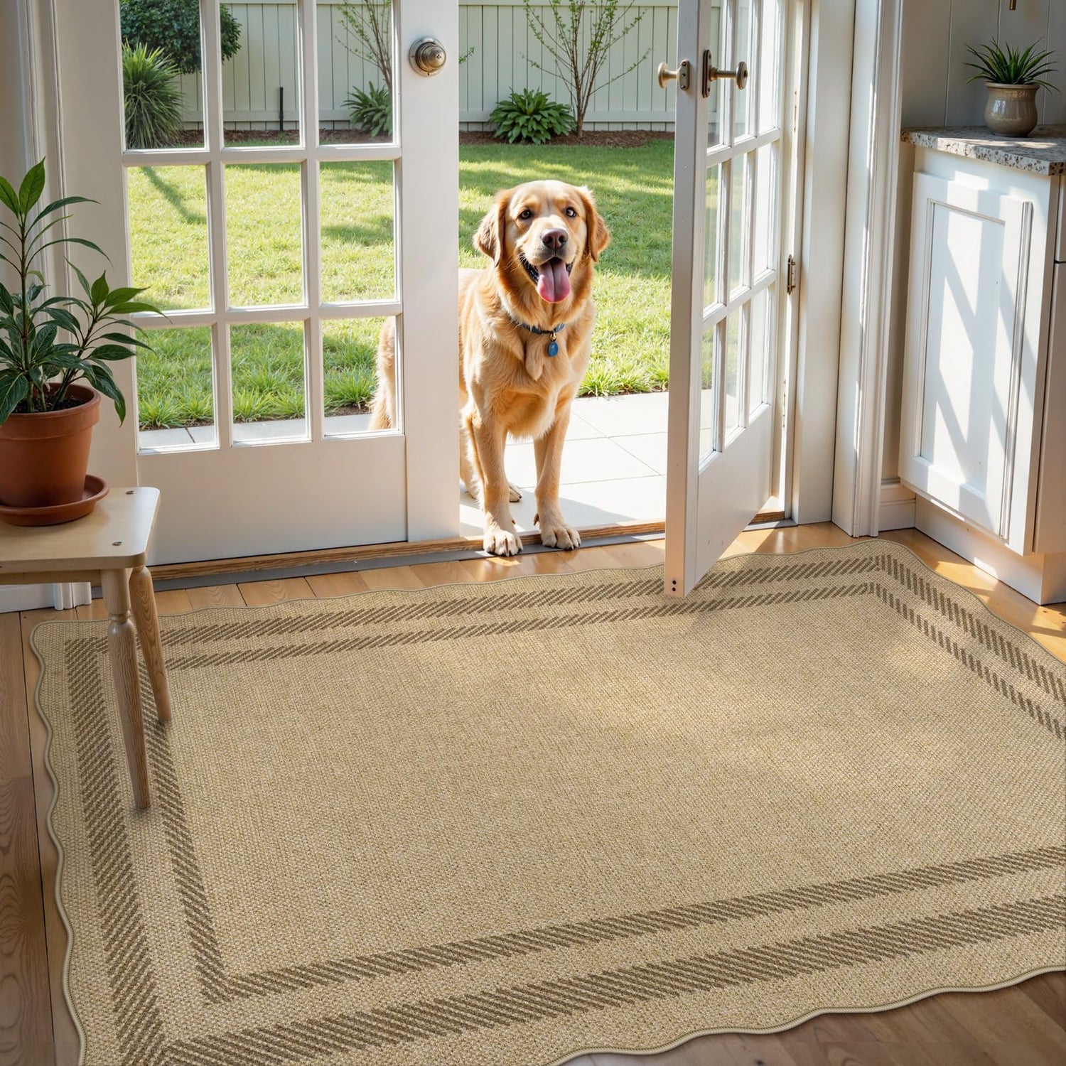 LIVEBOX Scalloped Easy Jute 3x5 Outdoor Rug, Washable Non-Slip Geometri Tan Rugs for Entryway, Indoor Outdoor Farmhouse Rug Morden Carpet Door Mat Area Rug for Bedroom Living Room Kitchen