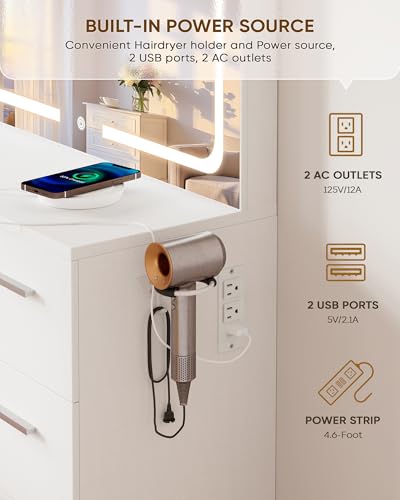 - 【POWER OUTLET & HAIRDRYER RACK】 LIVELYGLOW Makeup Vanity with lights include a built-in power outlet (With 2 AC outlets, 2 USB ports) convenient for charging your hair dryer, mobile phone and fill light, etc. And our vanity also equiped a hairdryer rack to keep your hairdryer.