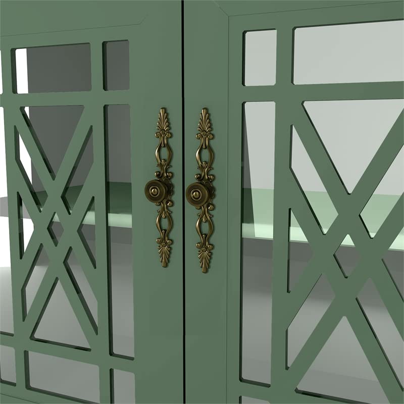 Details: Add a touch of vintage charm to your home with this unique and functional storage cabinet. Made with solid wood and high-grade MDF for long-lasting construction, this cabinet features two glass paneled doors with an intricate wood overlay, and vintage-style metal pulls. With adjustable shelves, this cabinet offers ample storage space that can be customized to fit your needs. Use it as a sideboard in the kitchen or dining room, a console in the living room, or an entryway storage solution. The quick-install hinges make assembly easy and hassle-free.