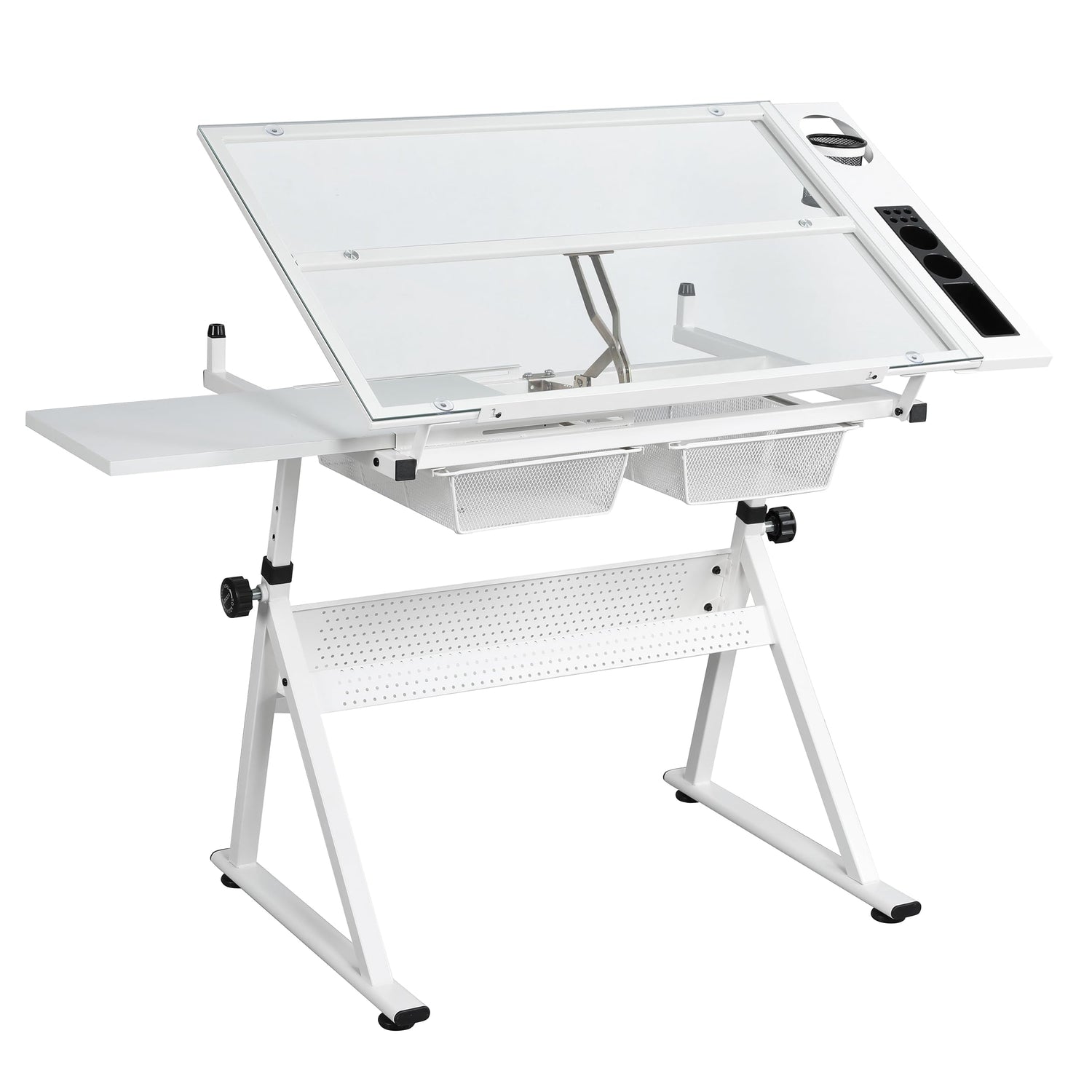 - LARGE STORAGE SPACE: This white glass-topped drafting table desk features a host of compartments and trays underneath for holding all of your paints, pens, and other small accessories, ensuring all drawing tools are easy to reach when brilliant ideas pop up. There is a 24-inch slide-up pencil ledge that expands your available space and hanging drawers beneath the tabletop hold stationery and other supplies at hand.