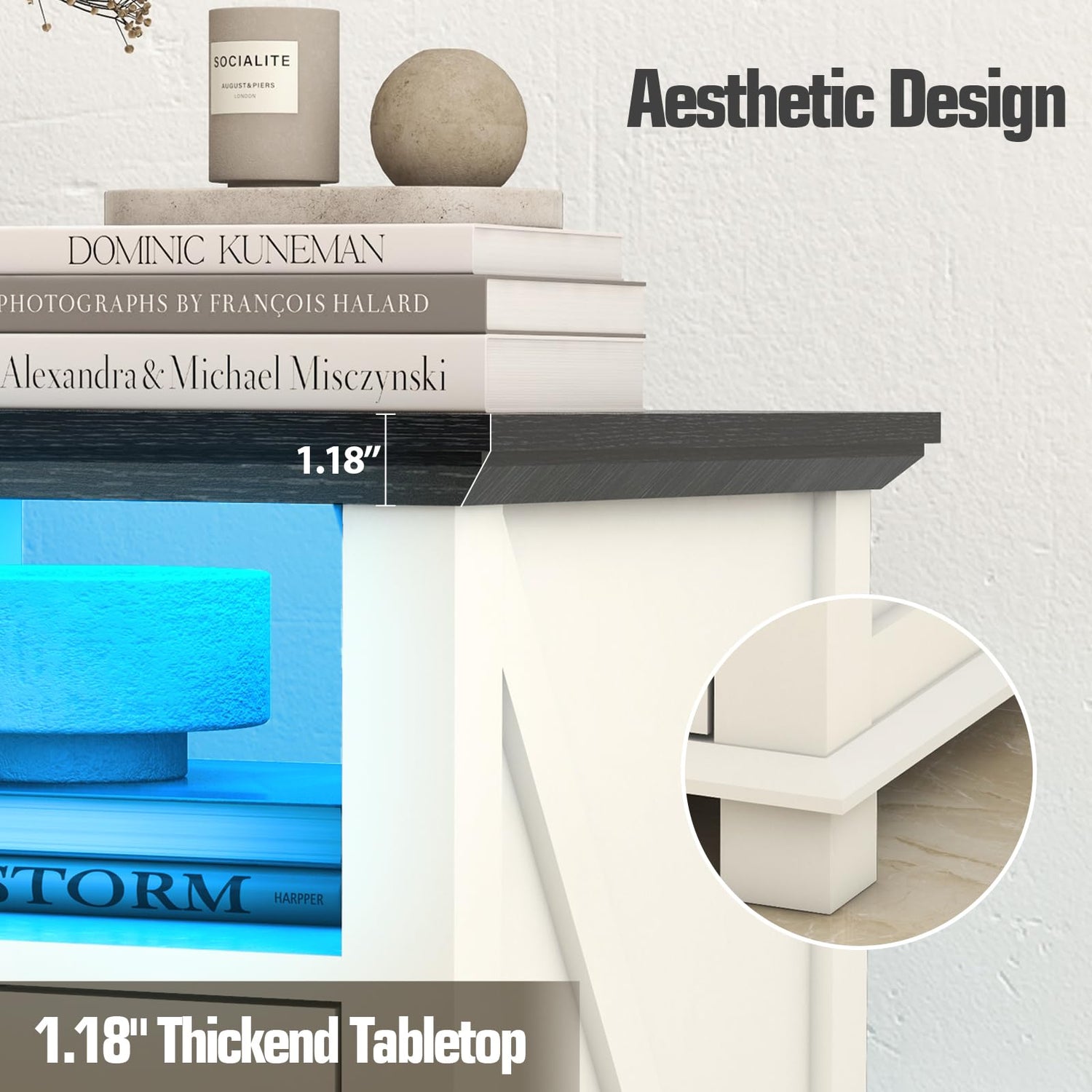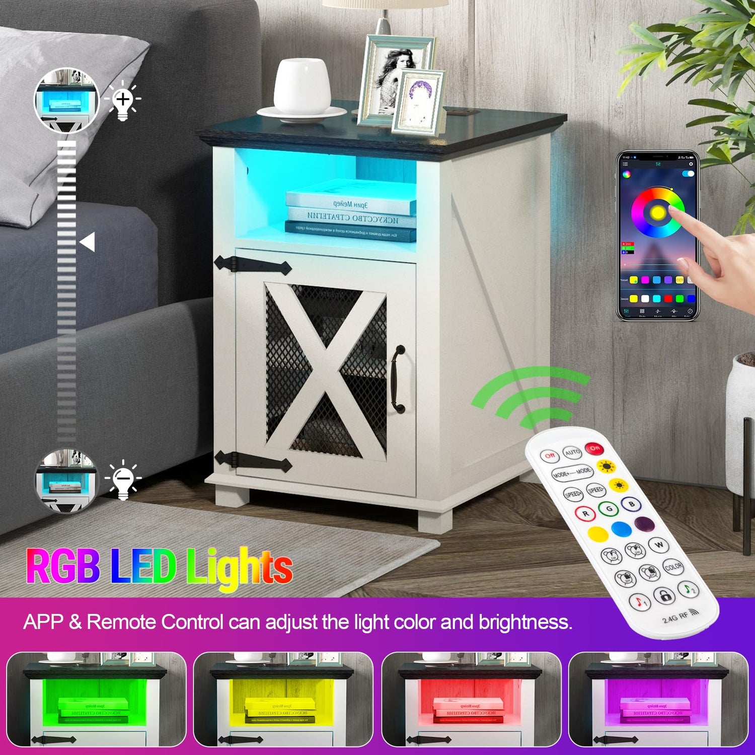 - Nightstands with LED Light: This farmhouse-style nightstand for bedroom is designed with color-changing LED light, which has different kinds of colors, modes and brightness, adding a comfortable atmosphere according your needs. It can also flash to musical rhythms.