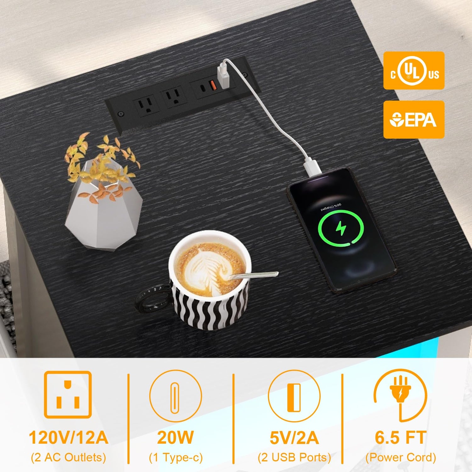 - Convenient Charging Station: You needn’t to worry about the low battery at all! With 2 AC outlets, 2 USB ports and 1 type-c, this charging end table allows you to charge up 5 devices simultaneously. Besides, there’s no need to place the table near the socket, because it has 6.5ft cord.