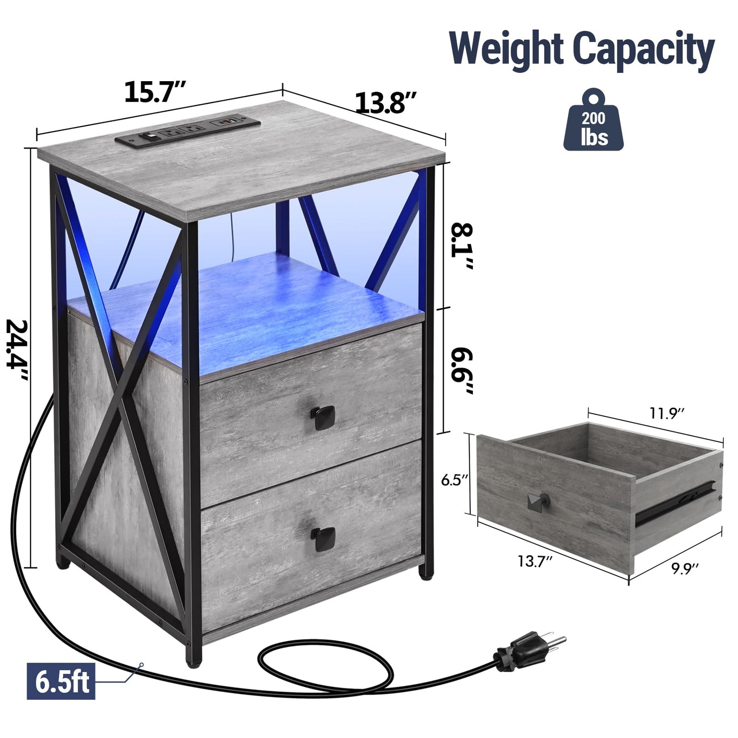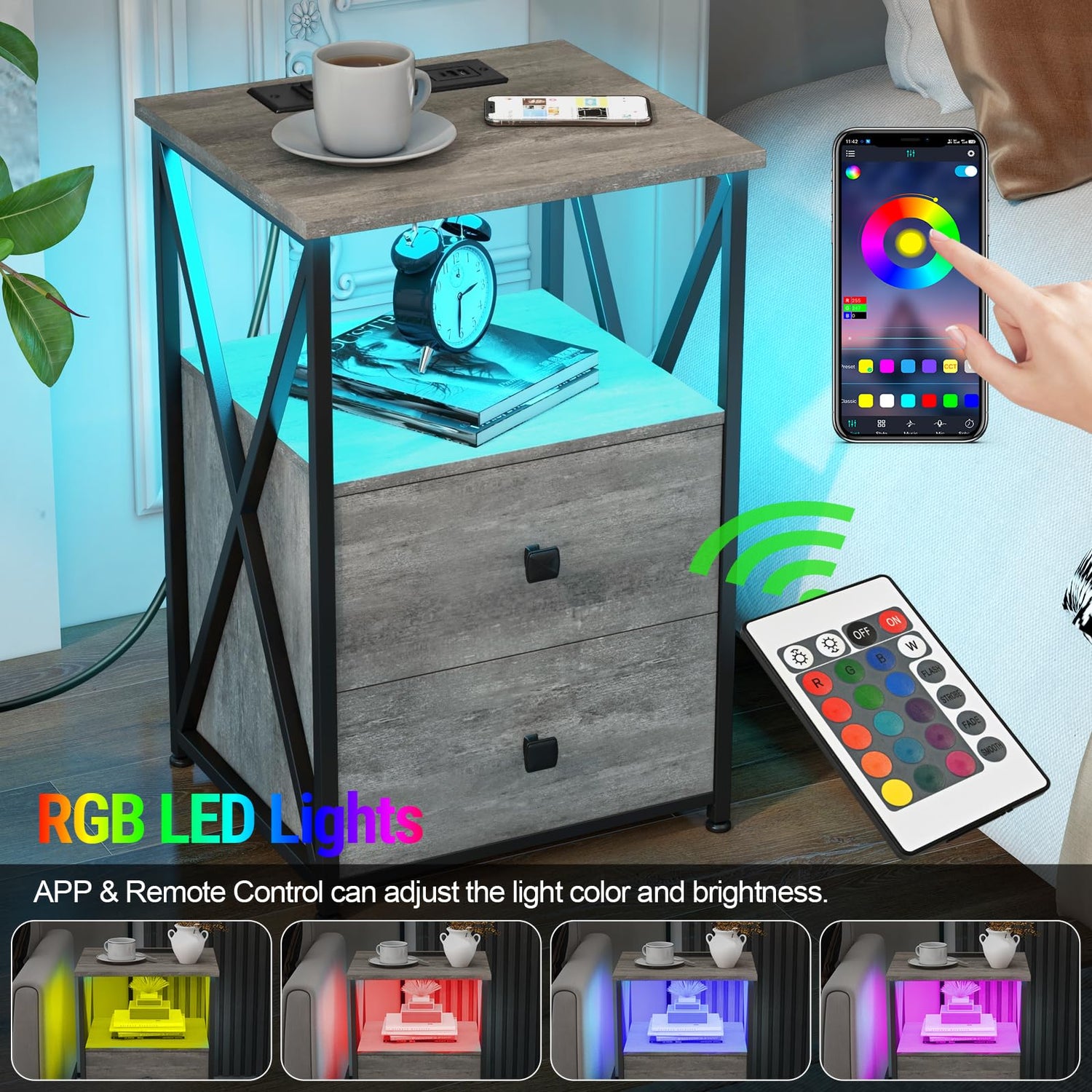 Livofloral LED Nightstand Set 2, Night Stand with Charging Station, Grey Side Table Set of 2 with Wood Drawers, End Tables with USB Ports and Outlets, Bedside Tables for Bedroom, End Table Living Room