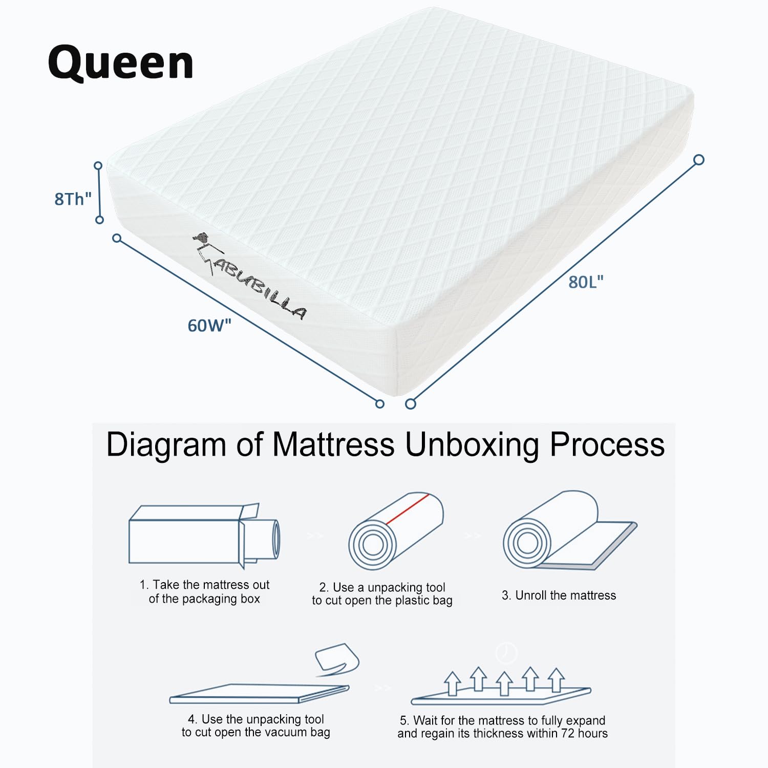 - 【Breathable High-Resilience Foam】 : This queen size mattress has a total thickness of 8 inches and is made of D2560 Medium-Resilience Foam, a breathable, high-resilience foam material that promotes air circulation and keeps you cool and comfortable all night long. The mattress provides good support and moderate softness to improve sleep comfort.