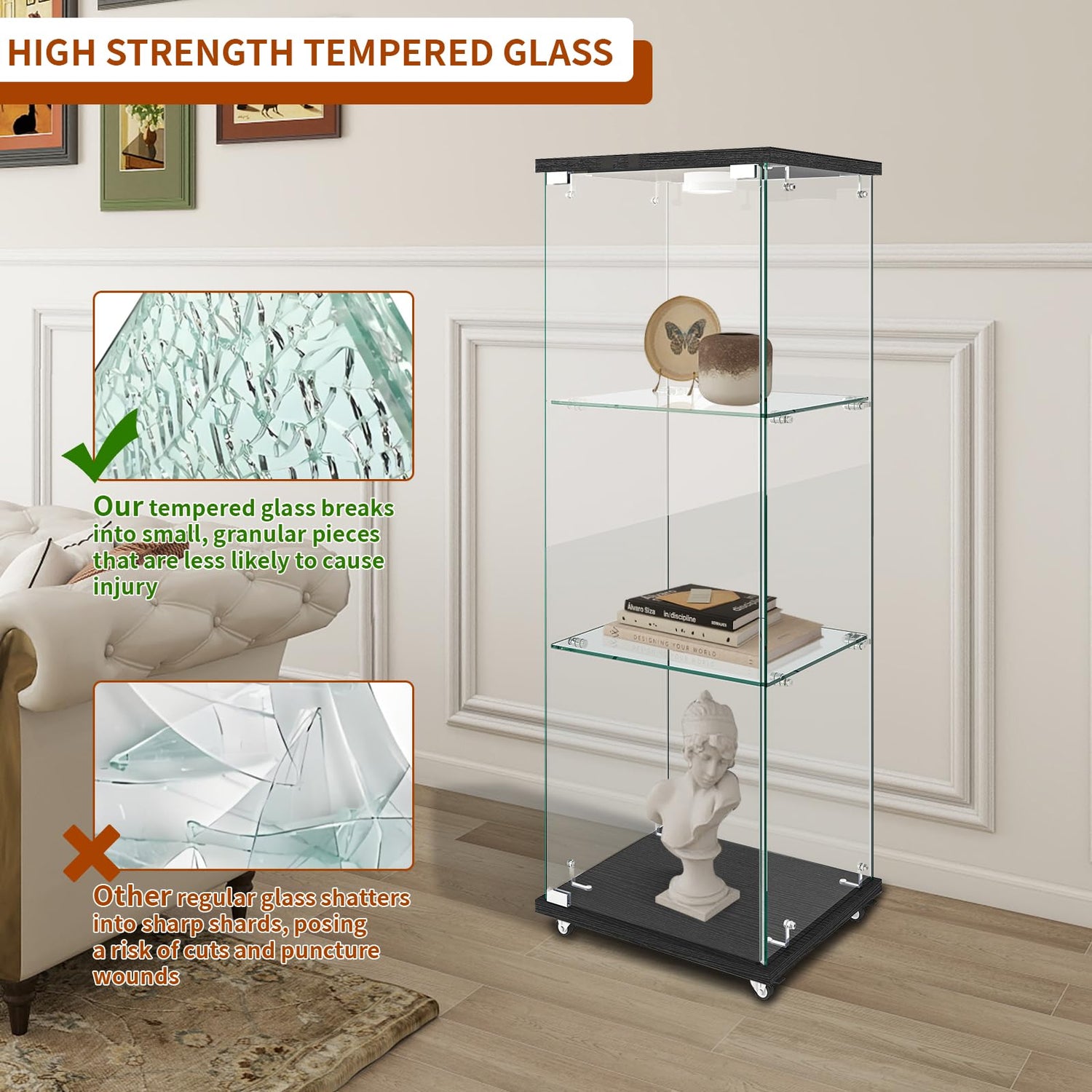 - 【Glass Display case with Wheel】This glass display cabinet is equipped with 4 high-quality, 360 degree rotating casters that provide smooth and effortless mobility in any direction. Simply press down lightly on the brake, and the cabinet will come to a stable stop. This design ensures both convenience and stability. The combination of full rotational capability and user-friendly braking functionality provides optimal control and security, enhancing the overall usability of the cabinet