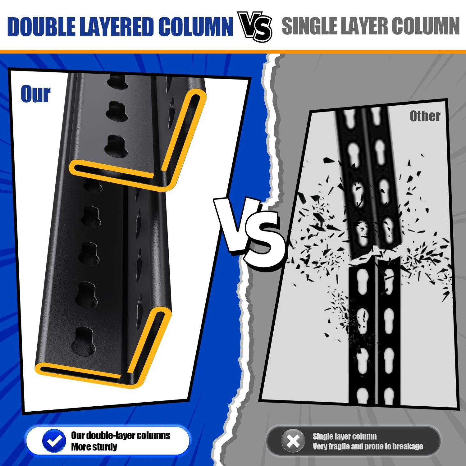 - Ultra-Strong Load-Bearing Garage Shelving That's Rock Solid:Our garage shelving holds up to 3500 lbs! The shelves feature an innovative double column design + bulkhead crossbar reinforcement for even weight distribution. Whether it's a heavy-duty toolbox, a full case of motor oil or a spare tire, this all-steel garage rack can hold them all, so you can say goodbye to the trouble of shaking and deformation.