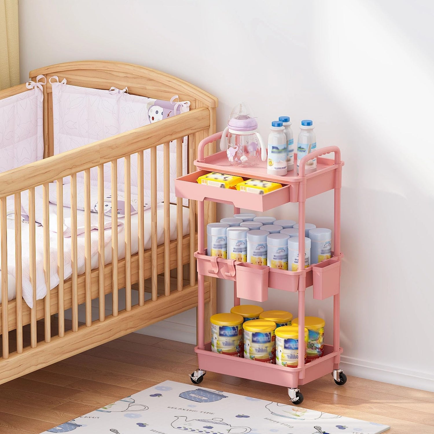 LLMRR 3 Tier Rolling Utility Cart with Drawer, Plastic Storage Organizer Rolling Carts with Wheels Handles Hanging Cups Hooks for Office, Bathroom, Kitchen,Craft Art Room (Pink)