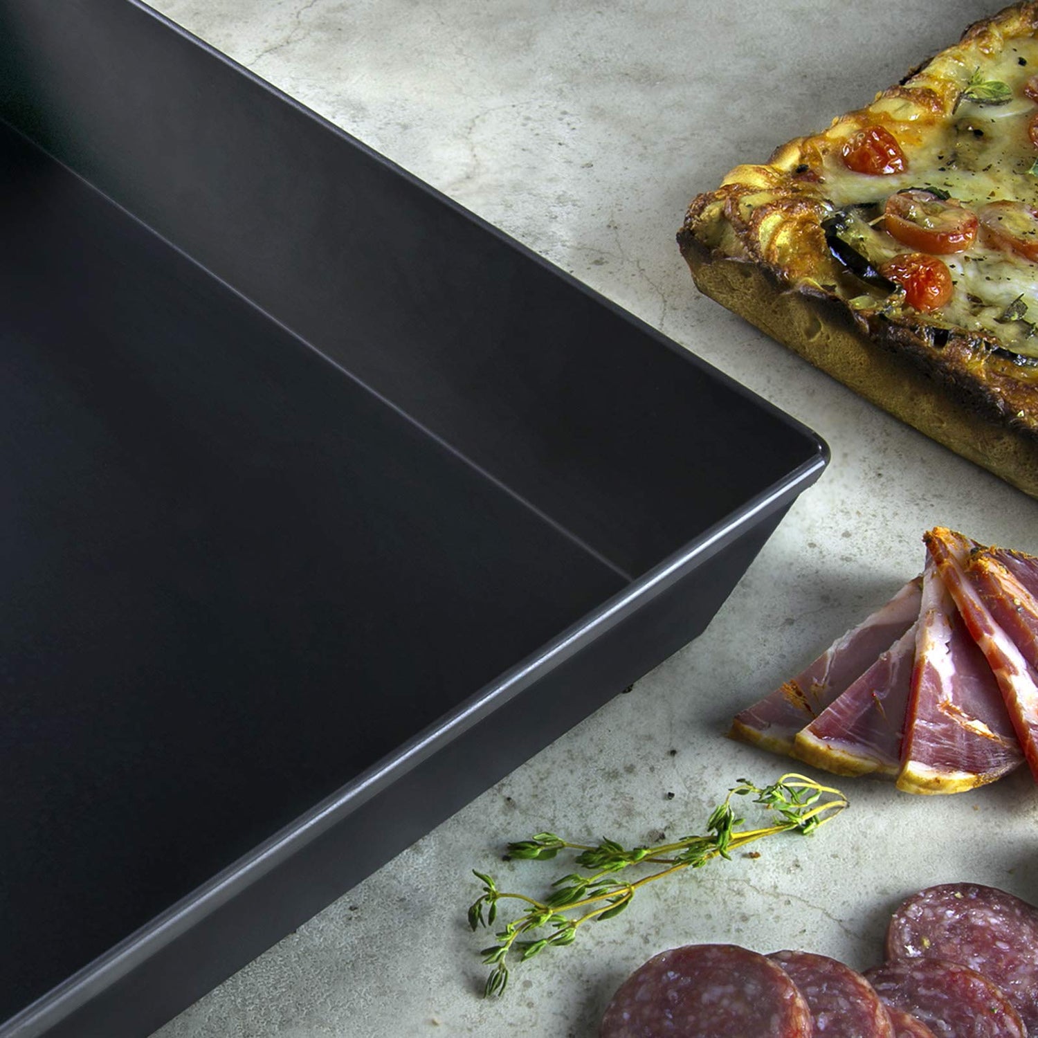 Details: 10X14 Inch Detroit Style Pizza Pan No Pre-Seasoning Required Made in the USA. Our exclusive Pre Seasoned Tuff-Kote finish (PSTK) is a permanent, non-toxic, stick-resistant coating that eliminates the need for any pre-seasoning and the hassle of maintaining seasoned pans. LloydPans pizza pans provide an easy release from the pan after baking, are metal utensil safe and are easy to clean. These commercial quality pans are the same that are used in Detroit Style pizza restaurants and match size specifications of the original blue steel pans. Made in our US manufacturing plant from heavy duty aluminum with PSTK finish, Detroit Style Pizza Pans from LloydPans will never rust, never need seasoning and will last for years. Dark coated pans tend to produce a little darker crust bake so you may need to adjust your temperature down or shorten your cooking time. Double thick flat rim adds strength and long-lasting durability. The 76° angle allows nesting when empty, saving storage space. Inside Top dimension 9.63x13.63 Inch