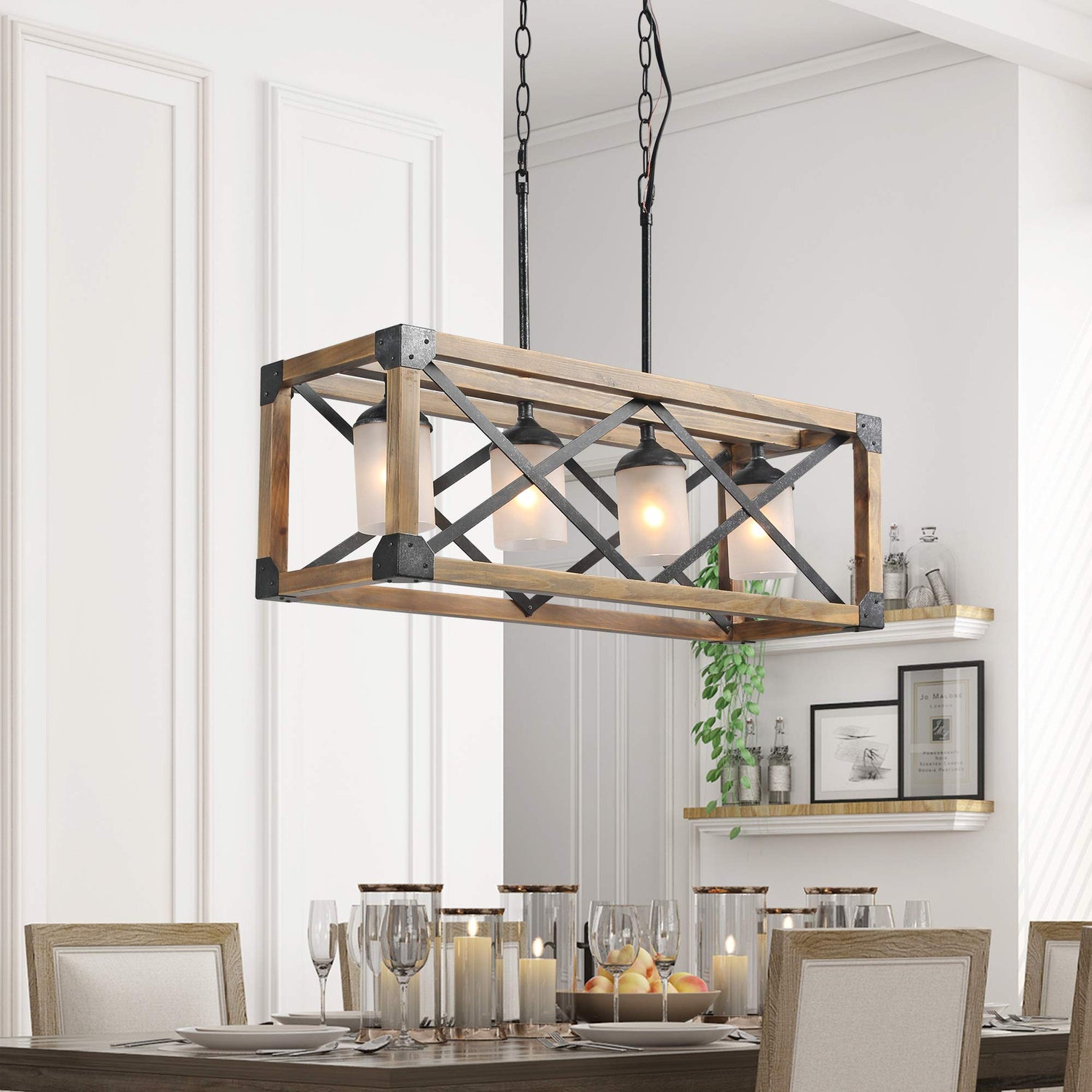 - Farmhouse Style Chandelier: Crafted with sturdy wood and metal, lead an artistic and farmhouse style to this chandelier light fixture. Highlighted by 4 high transmittance frosted glass globes, add charming attractive shines, it is perfect for the dining room, living room, kitchen, library, and so on.