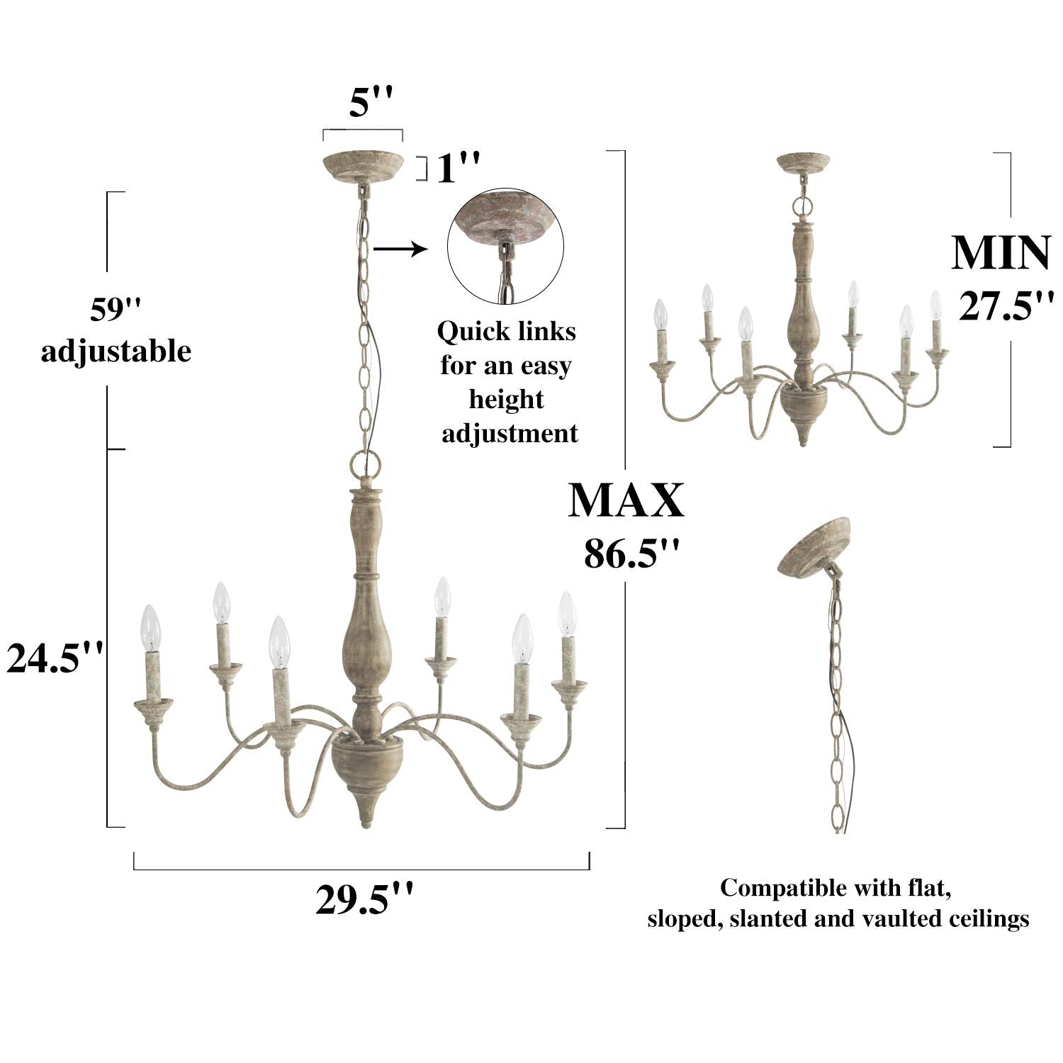 - HANDMADE DISTRESSED CHANDELIER: In addition to being UL listed for safety, the distressed wood, rust-colored arms, chain and canopy, and every part is completely handmade, bringing an affordable luxury along with unique French country sensations to your sweet home.